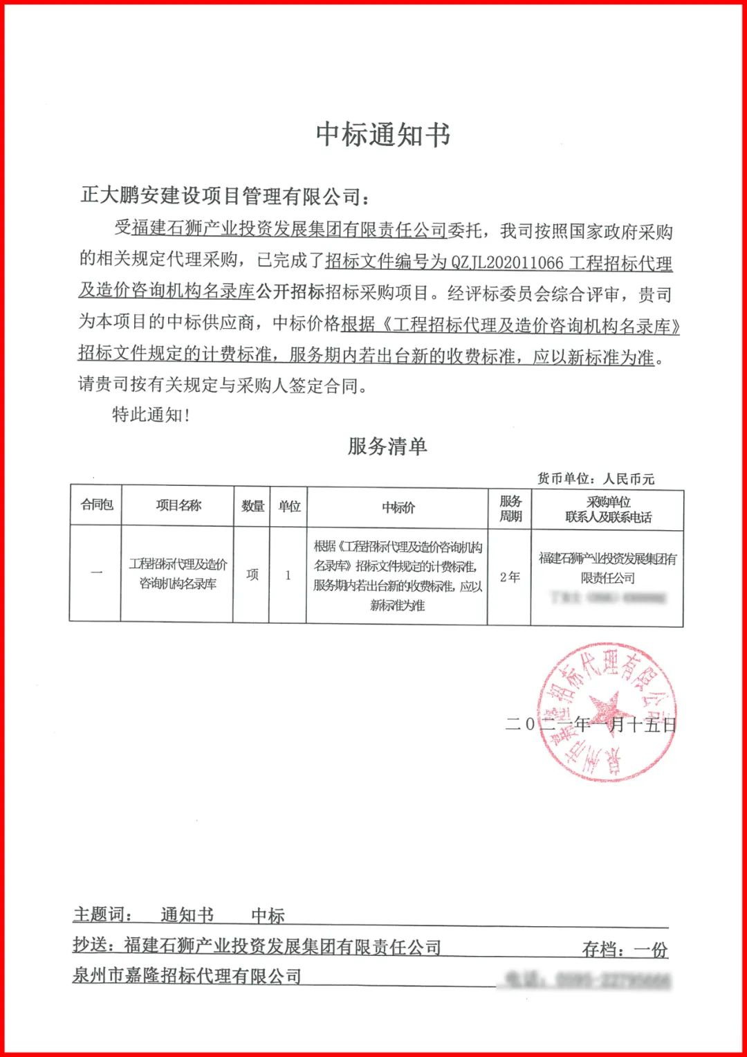 近日,福建石獅產(chǎn)業(yè)投資發(fā)展集團(tuán)有限責(zé)任公司委托第三方就“招標(biāo)文件編號為QZJL202011066 工程招標(biāo)代理及造價(jià)咨詢機(jī)構(gòu)名錄庫”項(xiàng)目進(jìn)行公開招標(biāo),經(jīng)評審委員會綜合評審,招標(biāo)人確認(rèn),正大鵬安建設(shè)項(xiàng)目管理有限公司為該項(xiàng)目的中標(biāo)供應(yīng)商,服務(wù)周期為兩年。