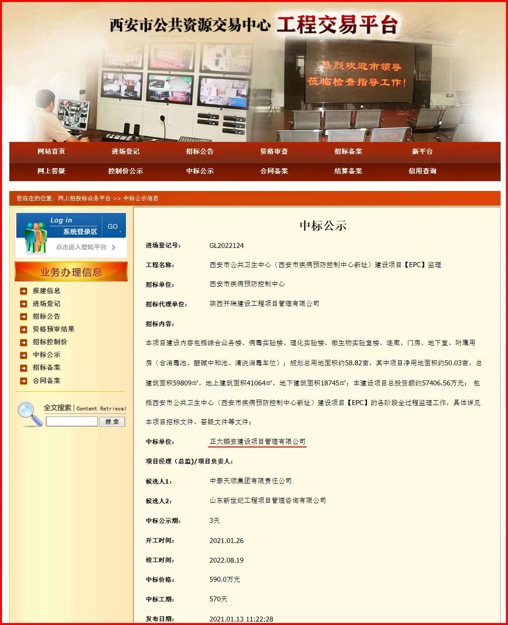 2021年1月,經(jīng)評(píng)標(biāo)委員會(huì)評(píng)定,招標(biāo)人確認(rèn),正大鵬安建設(shè)項(xiàng)目管理有限公司中標(biāo)西安市疾病預(yù)防控制中心的“西安市公共衛(wèi)生中心(西安市疾病預(yù)防 控制中心新址)建設(shè)項(xiàng)目【EPC】監(jiān)理