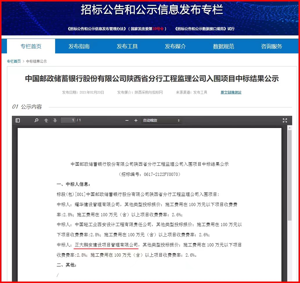 2021年2月,經評標委員會評定,招標人確認,正大鵬安建設項目管理有限公司入圍中國郵政儲蓄銀行股份有限公司的“中國郵政儲蓄銀行股份有限公司陜西省分行工程監(jiān)理”項目。