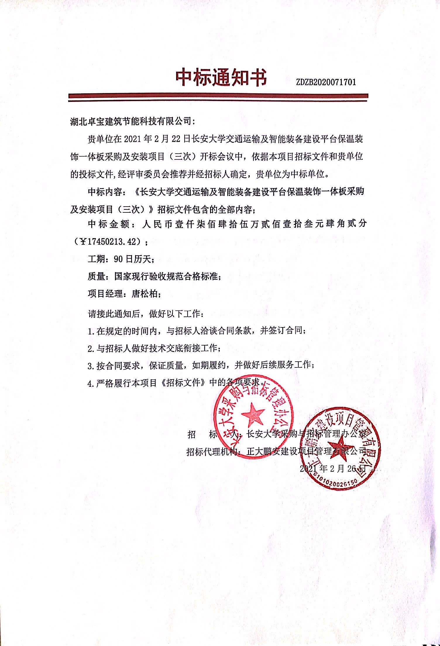長安大學(xué)交通運輸及智能裝備建設(shè)平臺保溫裝飾一體板采購及安裝項目
