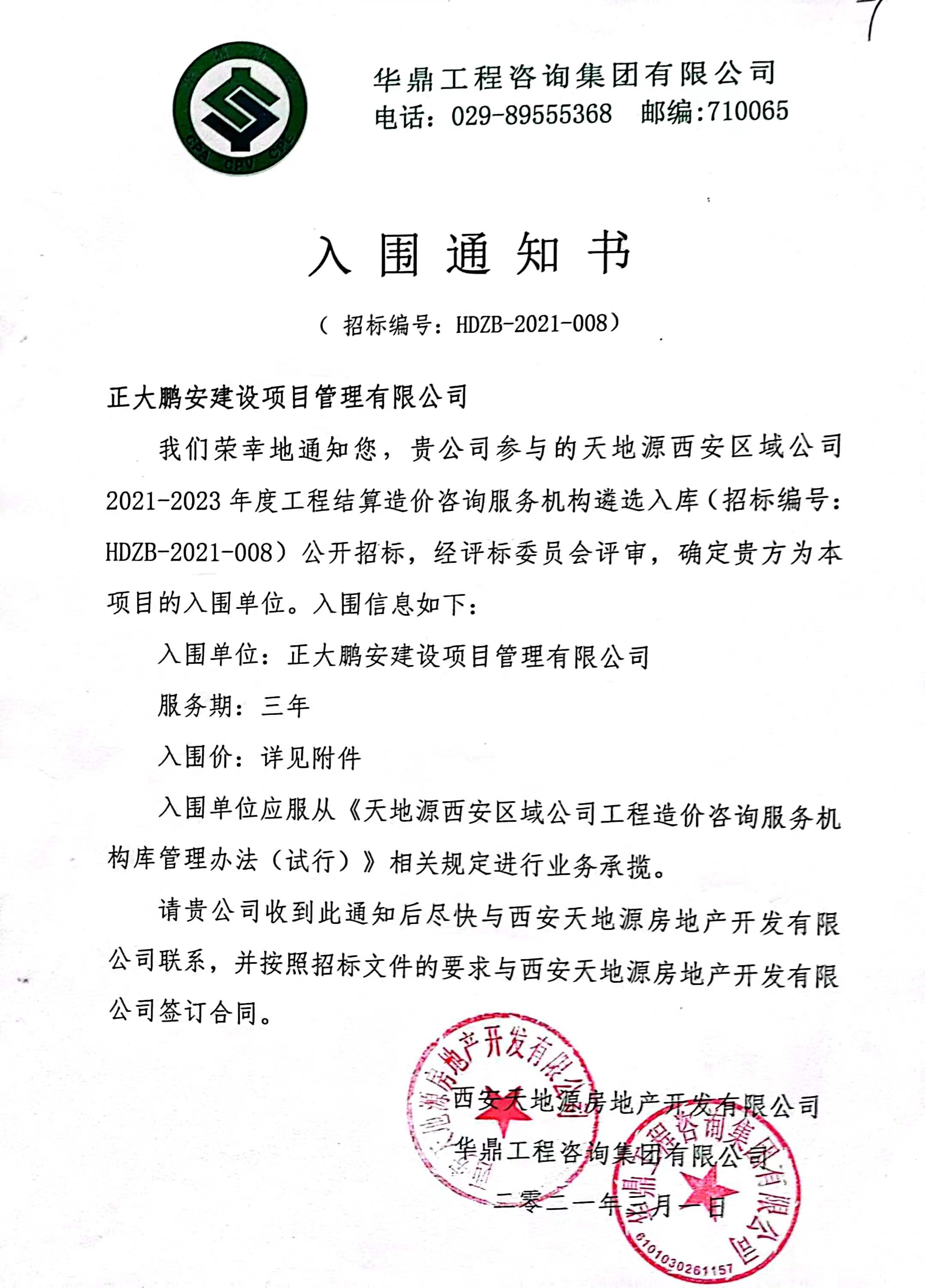 2021年2月,經(jīng)評標(biāo)委員會綜合評審,招標(biāo)確認(rèn),正大鵬安建設(shè)項目管理有限公司中標(biāo)“天地源西安區(qū)域公司2021-2023年度工程結(jié)算造價咨詢服務(wù)機構(gòu)遴選入庫”