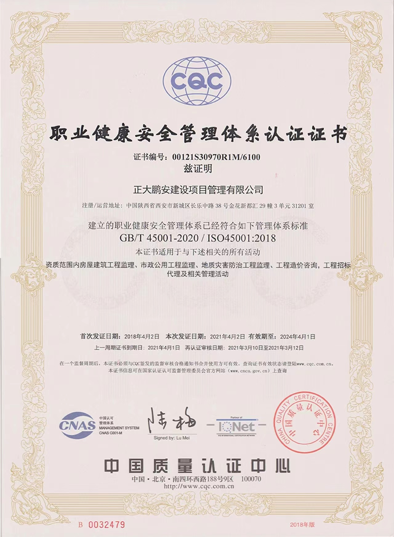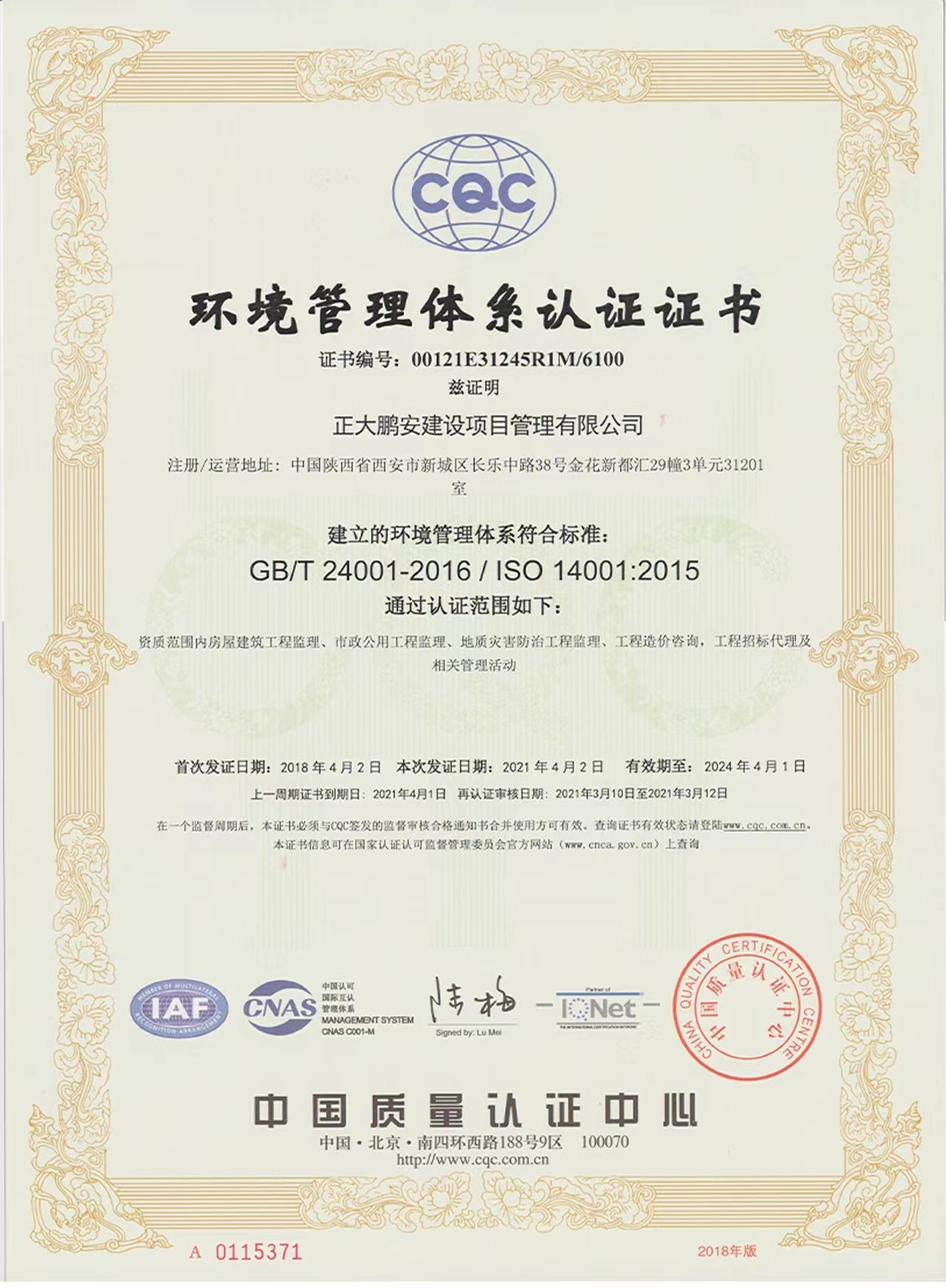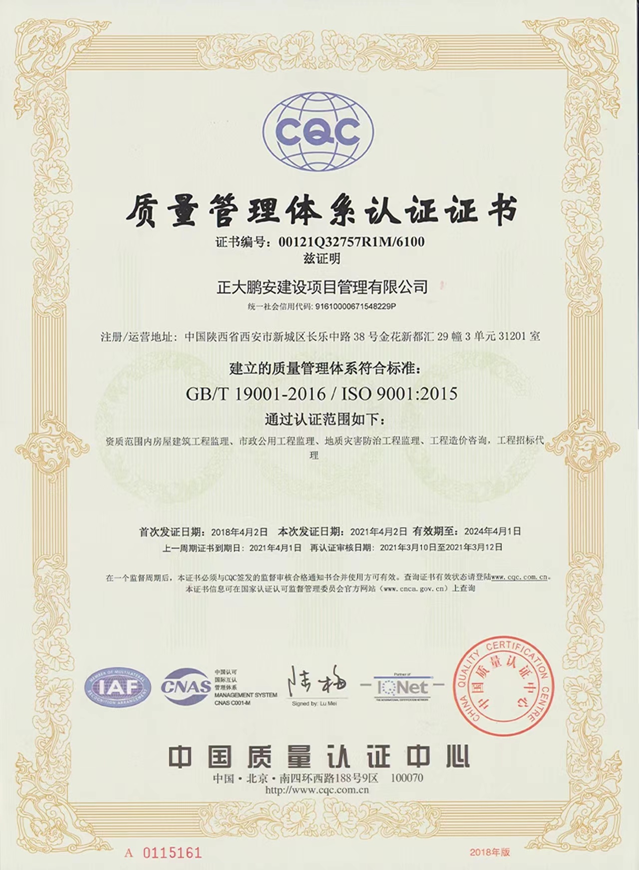 正大鵬安建設(shè)項(xiàng)目管理有限公司取得質(zhì)量管理體系、職業(yè)健康安全管理、環(huán)境管理體系認(rèn)證證書