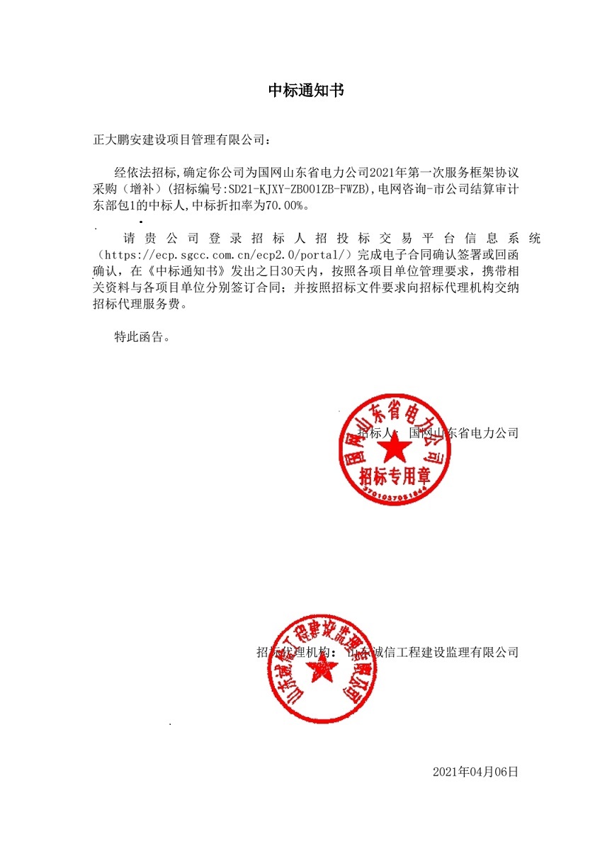 正大鵬安中標(biāo)國(guó)網(wǎng)山東省電力公司2021年第一次服務(wù)框架協(xié)議采購(gòu),電網(wǎng)咨詢-市公司結(jié)算審計(jì)_東部包1
