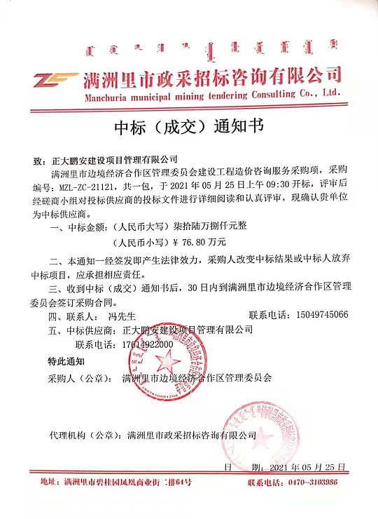 我公司參與滿洲里市邊境經(jīng)濟(jì)合作區(qū)管理委員會(huì)建設(shè)工程造價(jià)咨詢服務(wù)采購項(xiàng)目公開招標(biāo),經(jīng)依法招標(biāo),評(píng)審委員會(huì)綜合評(píng)審,招標(biāo)人確認(rèn),確認(rèn)正大鵬安建設(shè)項(xiàng)目管理有限公司中標(biāo)。