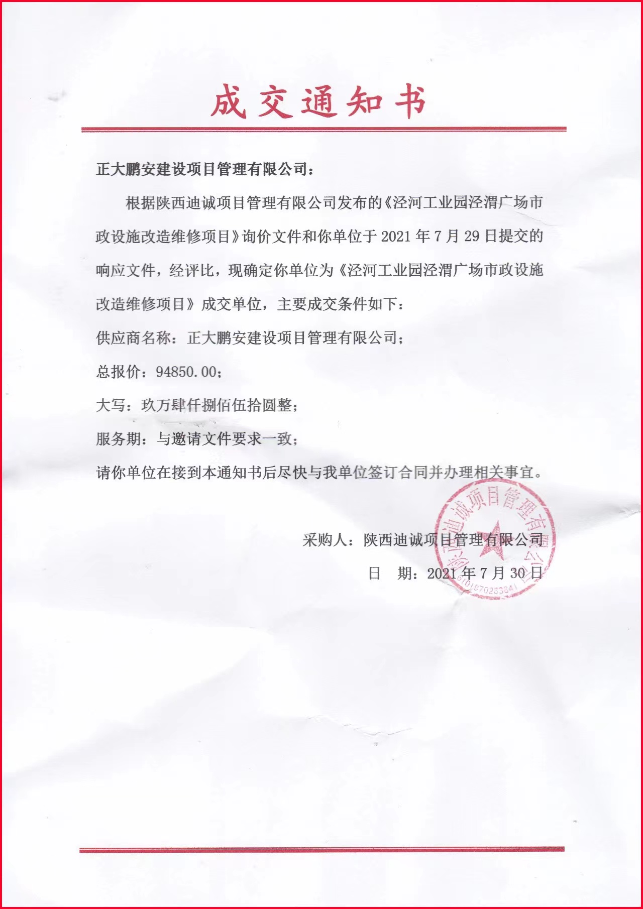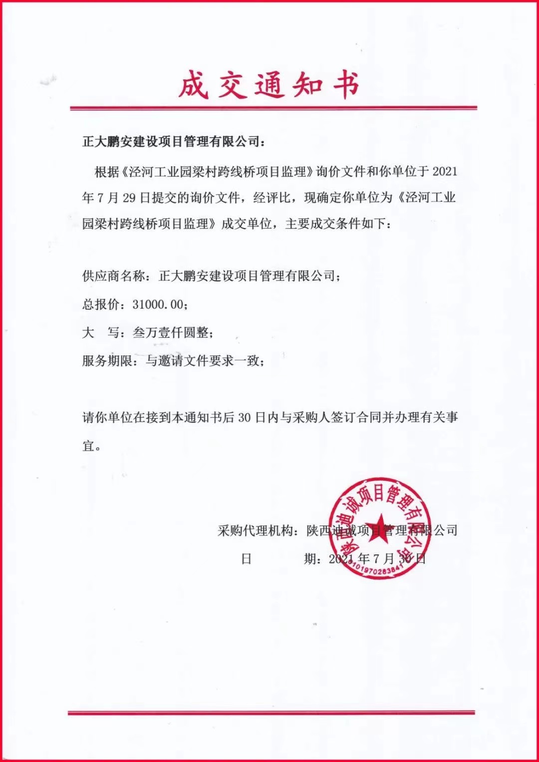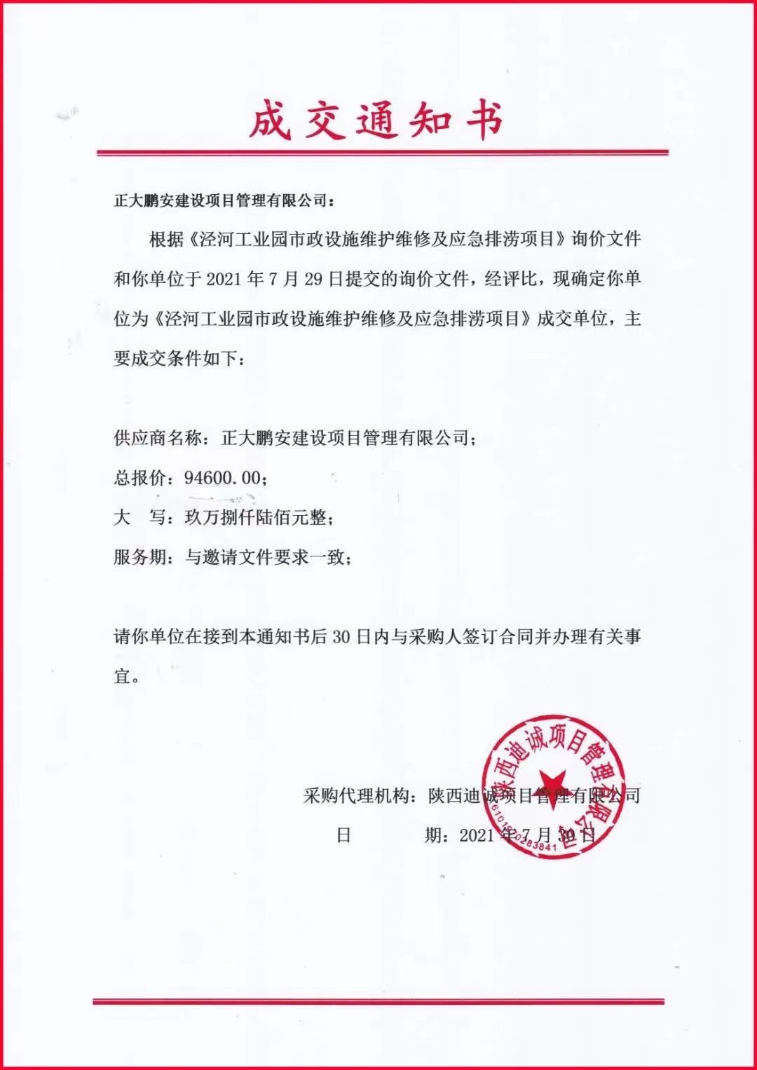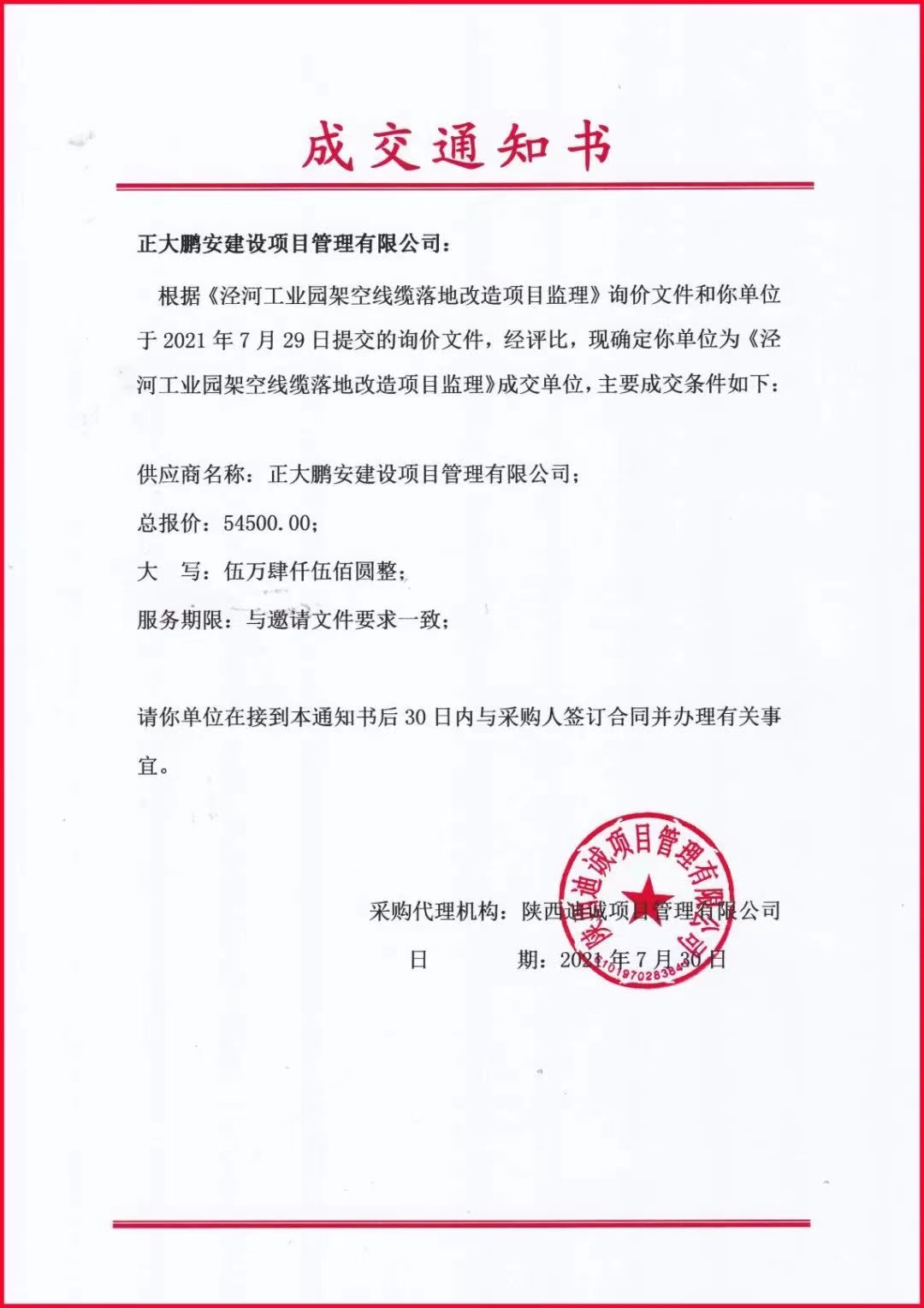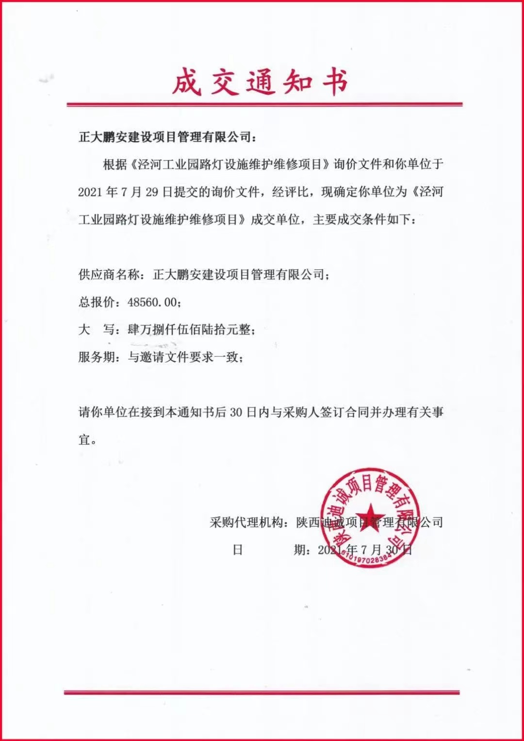 2021年8月,經(jīng)評標(biāo)委員會評定,招標(biāo)人確認(rèn),正大鵬安建設(shè)項目管理有限公司中標(biāo)西安涇河工業(yè)園管理委員會的“ 涇河工業(yè)園架空線纜落地改造項目、涇河工業(yè)園梁村跨線橋項目、涇河工業(yè)園市政設(shè)施維護(hù)維修及應(yīng)急排澇項目、涇河工業(yè)園路燈設(shè)施維護(hù)維修項目、涇河工業(yè)園涇渭廣場市政設(shè)施改造維修項目”。