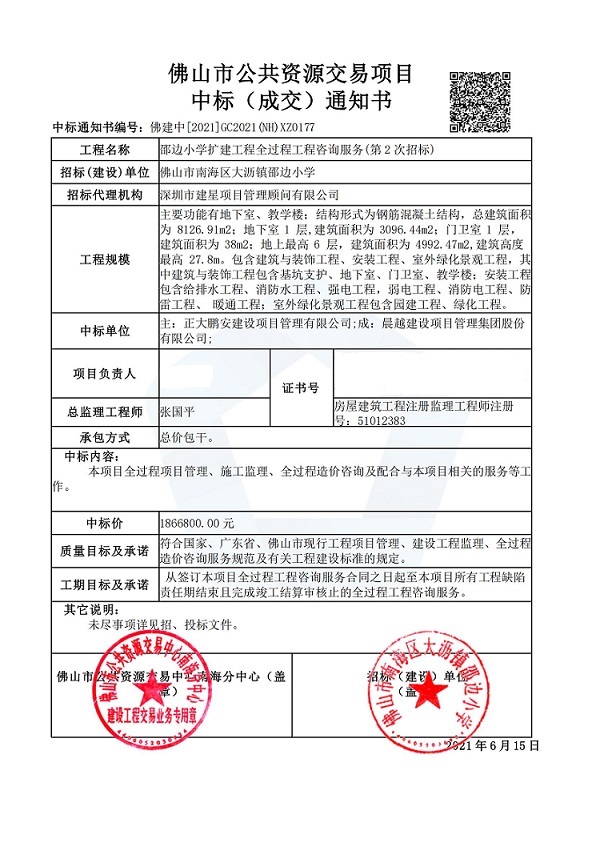 2021年6月15日,經(jīng)評(píng)標(biāo)委員會(huì)綜合評(píng)審,招標(biāo)人確認(rèn),正大鵬安建設(shè)項(xiàng)目管理有限公司中標(biāo)佛山市南海區(qū)大瀝鎮(zhèn)邵邊小學(xué)擴(kuò)建工程全過程工程咨詢服務(wù)項(xiàng)目。
