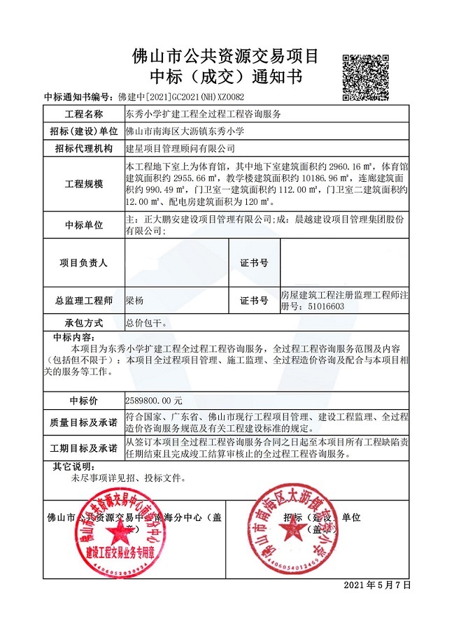 2021年5月7日,經(jīng)評(píng)標(biāo)委員會(huì)綜合評(píng)審,招標(biāo)人確認(rèn),正大鵬安建設(shè)項(xiàng)目管理有限公司中標(biāo)佛山市南海區(qū)大瀝鎮(zhèn)東秀小學(xué)擴(kuò)建工程全過(guò)程工程咨詢服務(wù)項(xiàng)目。