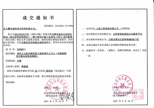 近日,我公司參與了“呂梁市老舊小區(qū)綜合改造(離石區(qū)濱河街道辦)一期工程設(shè)計(jì)施工總承包(EPC)項(xiàng)目監(jiān)理”,經(jīng)評標(biāo)委員會綜合評審,招標(biāo)人確認(rèn),正大鵬安建設(shè)項(xiàng)目管理有限公司為中標(biāo)人。