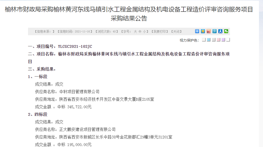 正大鵬安中標(biāo)榆林市財政局采購榆林黃河?xùn)|線馬鎮(zhèn)引水工程金屬結(jié)構(gòu)及機(jī)電設(shè)備工程造價評審咨詢服務(wù)項(xiàng)目四標(biāo)段