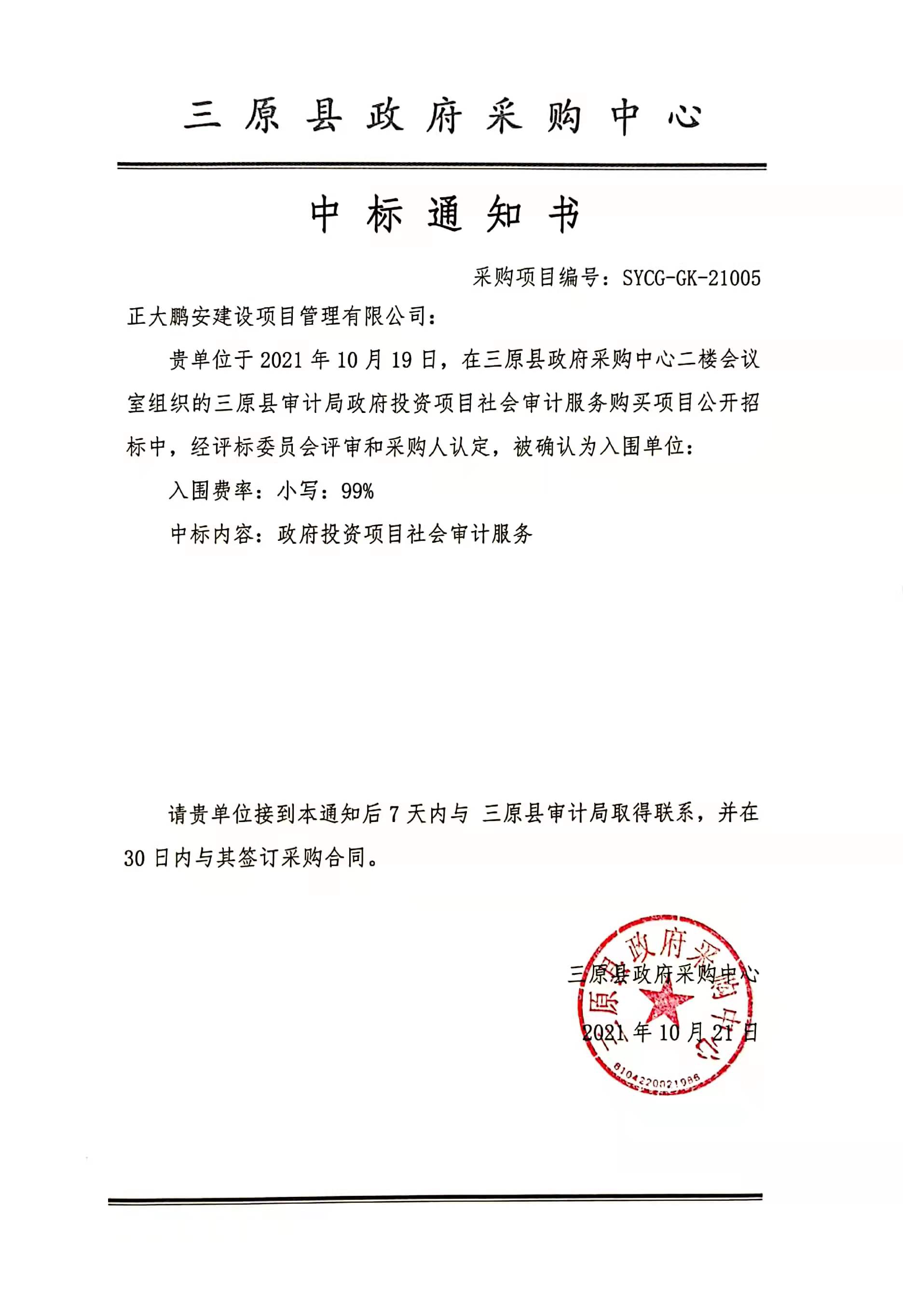 正大鵬安中標(biāo)三原縣審計(jì)局政府投資項(xiàng)目社會(huì)審計(jì)服務(wù)購(gòu)買項(xiàng)目