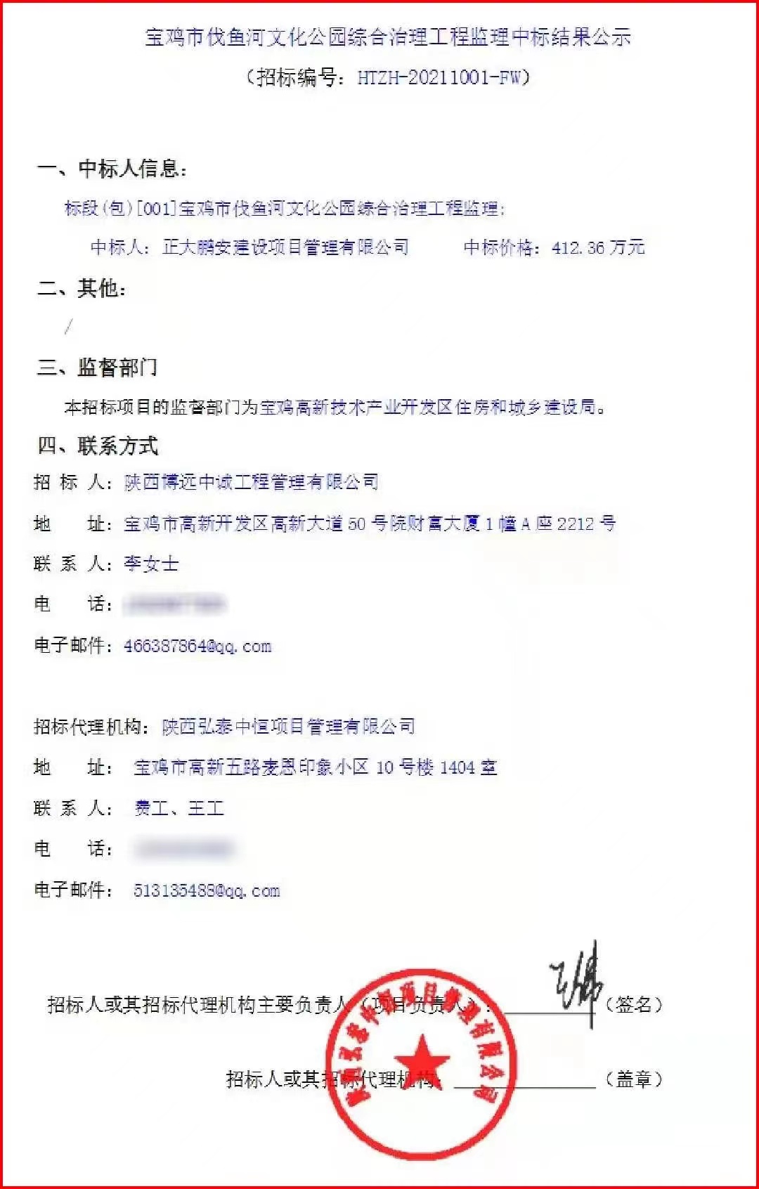 2021年12月,經(jīng)評(píng)標(biāo)委員會(huì)評(píng)定,招標(biāo)人確認(rèn),正大鵬安建設(shè)項(xiàng)目管理有限公司中標(biāo)陜西弘泰中恒項(xiàng)目管理有限公司的“寶雞市伐魚(yú)河文化公園綜合治理工程監(jiān)理”項(xiàng)目。