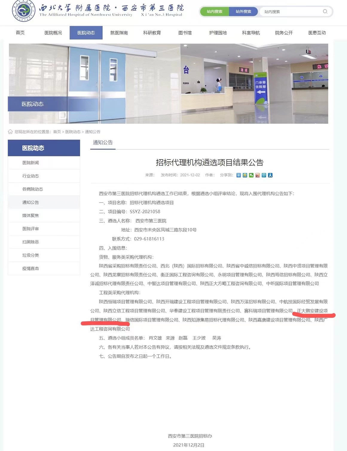 正大鵬安入圍西安市第三醫(yī)院招標(biāo)代理機(jī)構(gòu)遴選項(xiàng)目