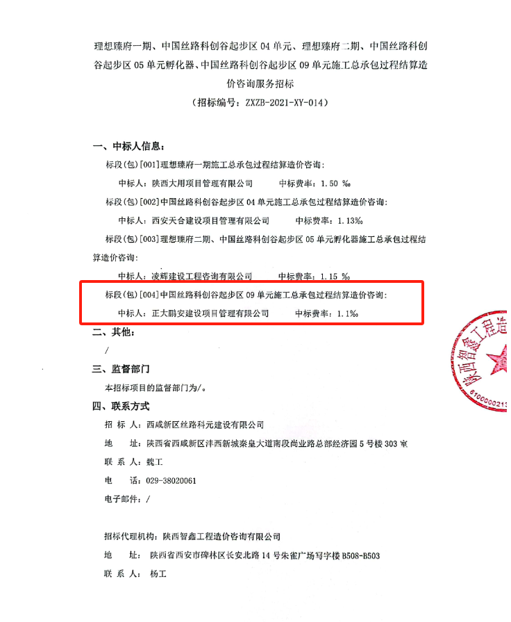 近日,西咸新區(qū)絲路科元建設(shè)有限公司對“中國絲路科創(chuàng)谷起步區(qū)09單元施工總承包過程結(jié)算造價咨詢服務(wù)招標(biāo)”進(jìn)行公開招標(biāo),經(jīng)評標(biāo)委員會綜合評審,招標(biāo)人確認(rèn),正大鵬安建設(shè)項(xiàng)目管理有限公司為第4包中標(biāo)人。