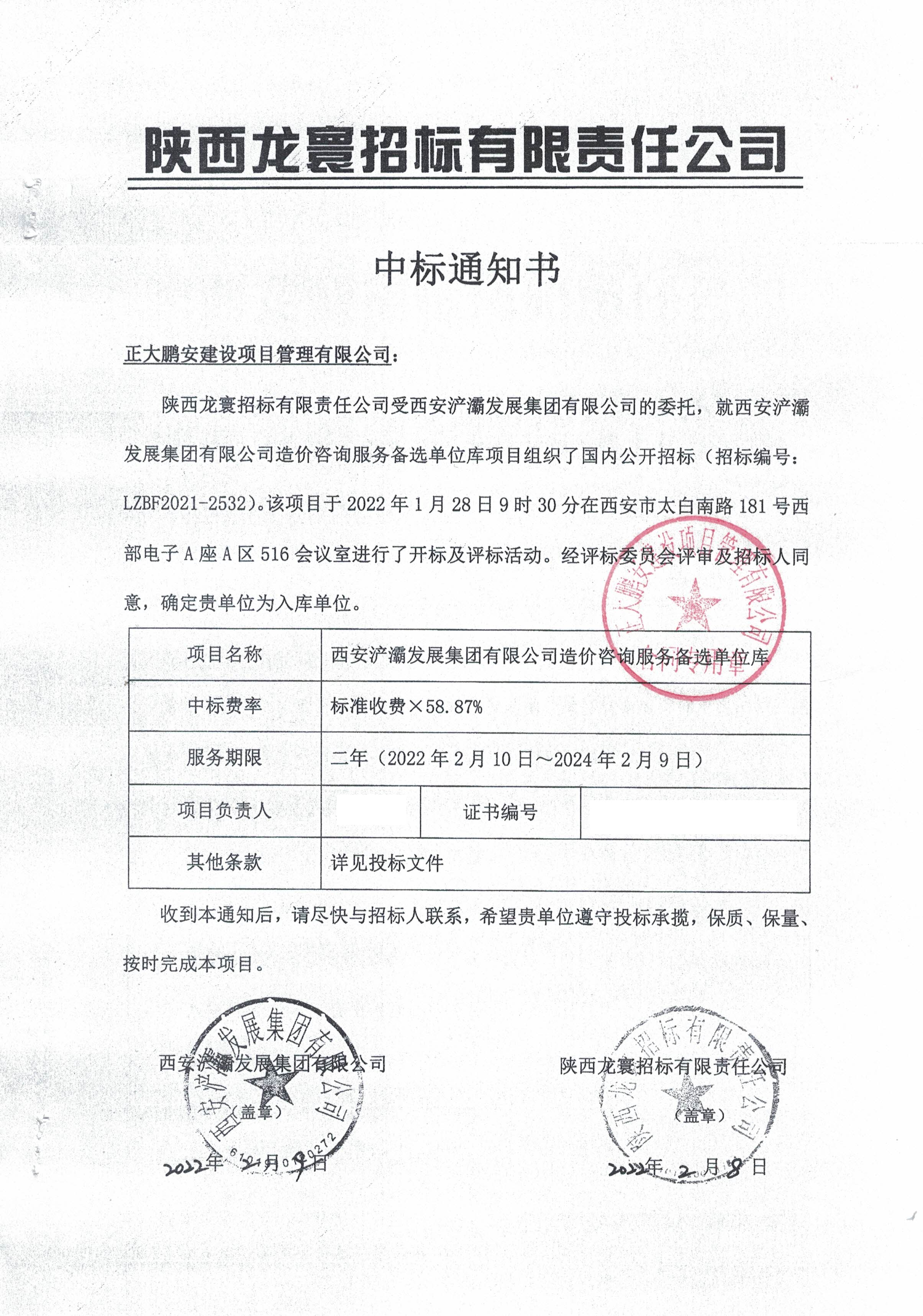 正大鵬安中標西安浐灞發(fā)展集團有限公司造價咨詢服務備選單位庫