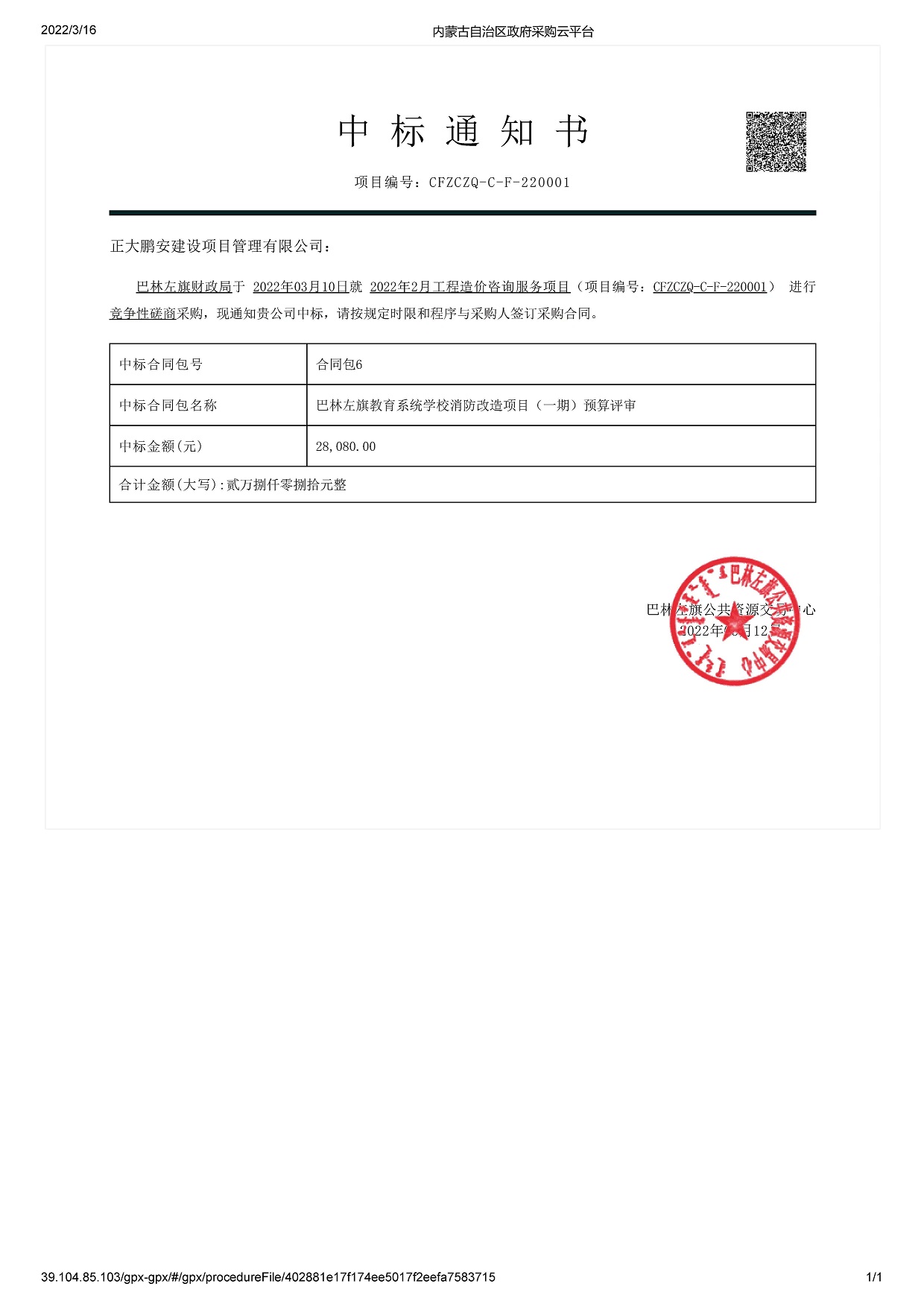 正大鵬安中標(biāo)巴林左旗財(cái)政局2022年2月工程造價(jià)咨詢服務(wù)項(xiàng)目合同包6(巴林左旗教育系統(tǒng)學(xué)校消防改造項(xiàng)目(一期)預(yù)算評(píng)審)