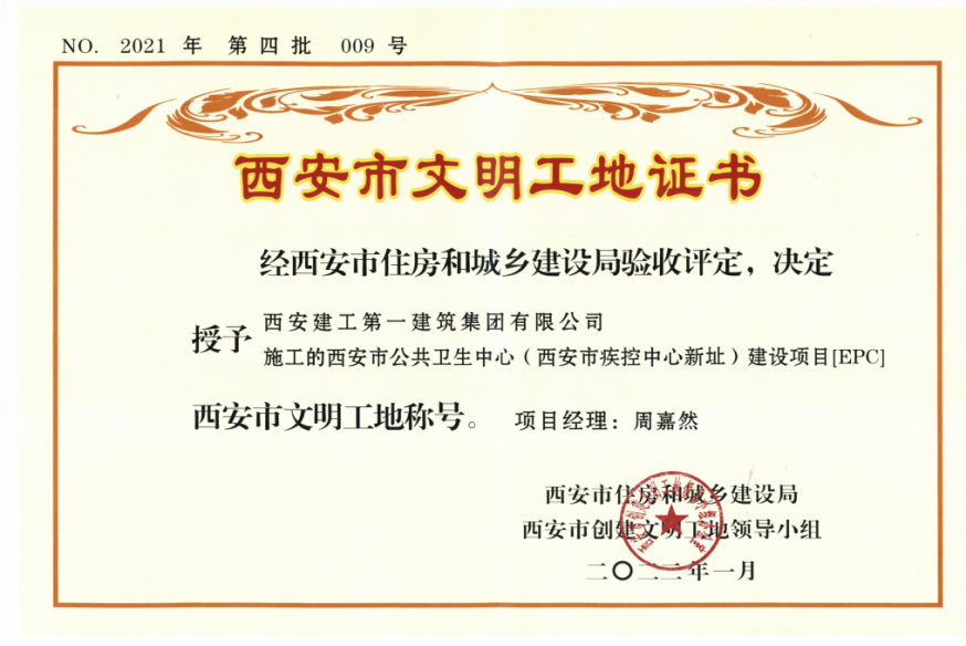 正大鵬安公司監(jiān)理的西安市公共衛(wèi)生中心(西安市疾控中心新址)建設(shè)項目【EPC】監(jiān)理,在西安市2021年第四批文明工地評選活動中,榮獲“西安市文明工地稱號”。