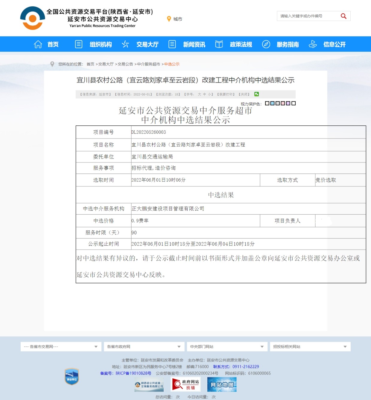 2022年6月1日,正大鵬安建設(shè)項(xiàng)目管理有限公司在延安市公共資源交易中心中介服務(wù)超市機(jī)構(gòu)中選宜川縣農(nóng)村公路(宜云路劉家卓至云巖段)改建工程。