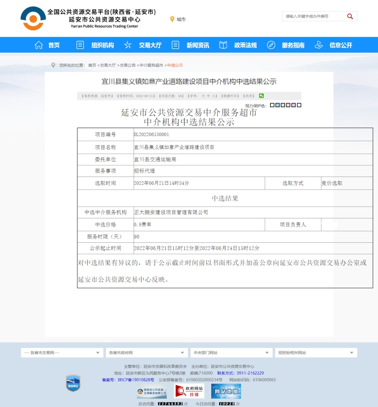 2022年6月21日,正大鵬安建設(shè)項目管理有限公司在延安市公共資源交易中心中介服務(wù)超市機構(gòu)中選宜川縣集義鎮(zhèn)如意產(chǎn)業(yè)道路建設(shè)項目。