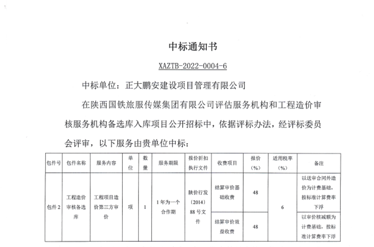 正大鵬安中標(biāo)陜西國鐵旅服傳媒集團(tuán)有限公司評估服務(wù)機(jī)構(gòu)和工程造價(jià)審核服務(wù)機(jī)構(gòu)備選庫入庫項(xiàng)目