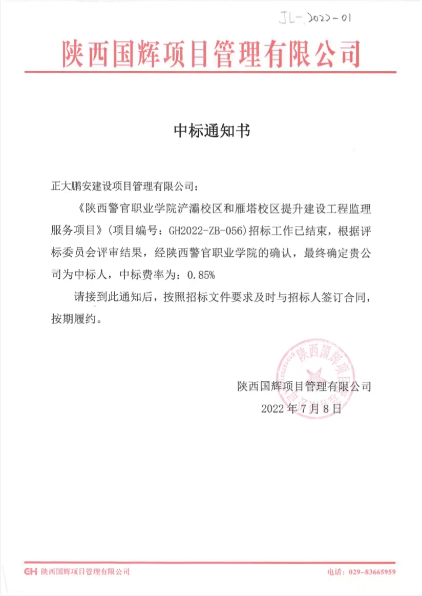2022年7月,經(jīng)評標委員會評定,招標人確認,正大鵬安建設項目管理有限公司中標陜西警官學院的“陜西警官職業(yè)學院浐灞校區(qū)和雁塔校區(qū)提升建設工程監(jiān)理服務項目”項目。
