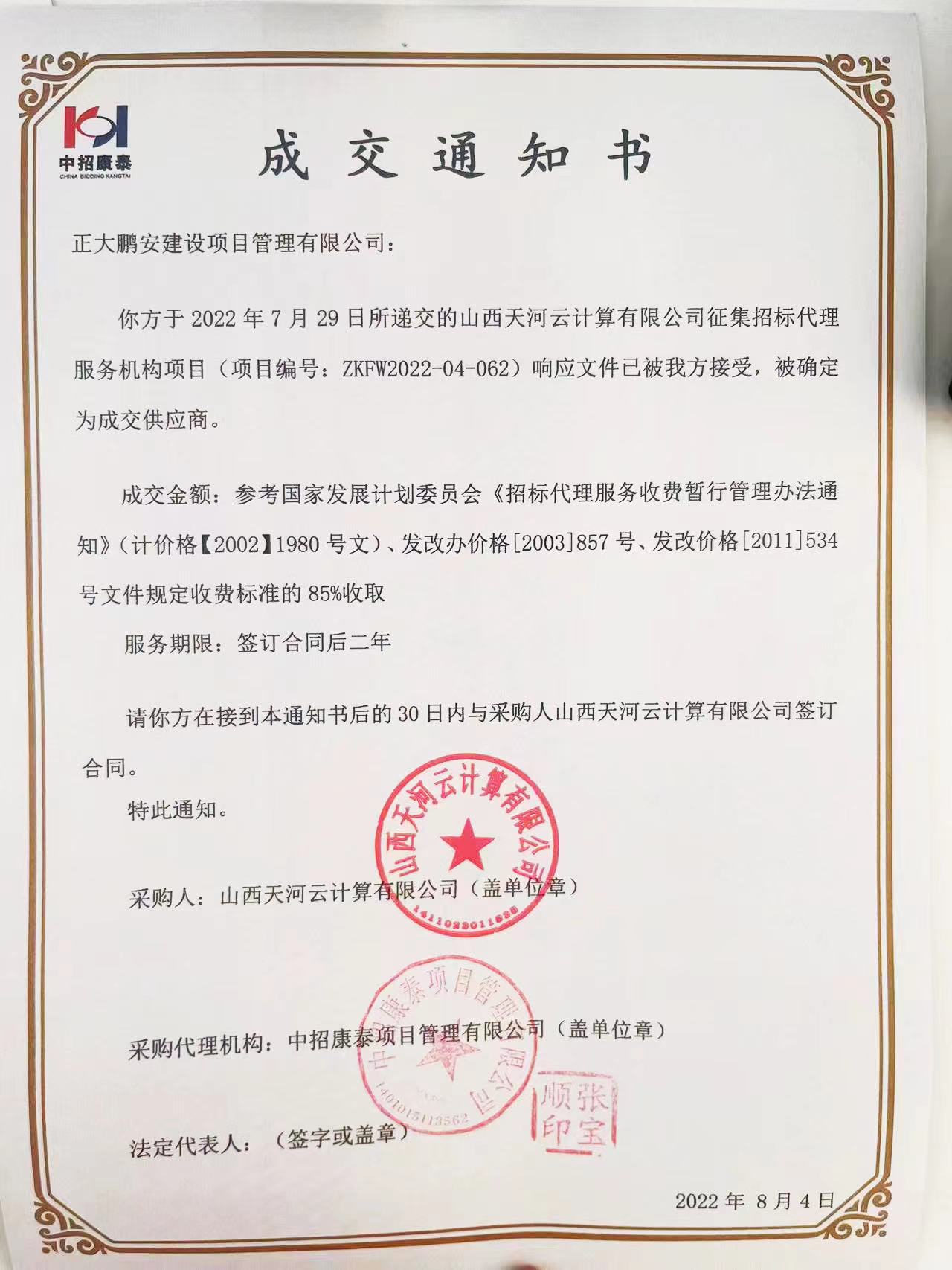 2022年8月4號,經(jīng)評標委員會綜合評審,招標人確認,正大鵬安建設項目管理有限公司中標山西天河云計算有限公司征集招標代理服務機構(gòu)項目。
