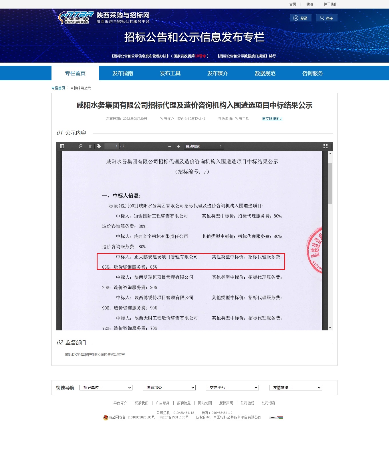 近日,我公司參與”咸陽水務(wù)集團(tuán)有限公司招標(biāo)代理及造價咨詢機(jī)構(gòu)入圍遴選項目”項目,經(jīng)評審委員會綜合評審,招標(biāo)人確認(rèn),正大鵬安公司入圍本項目采購代理機(jī)構(gòu)。