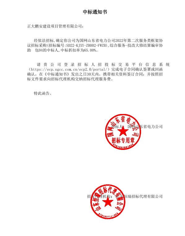 正大鵬安中標(biāo)國(guó)網(wǎng)山東省電力公司綜合服務(wù)技改大修編審協(xié)助項(xiàng)目