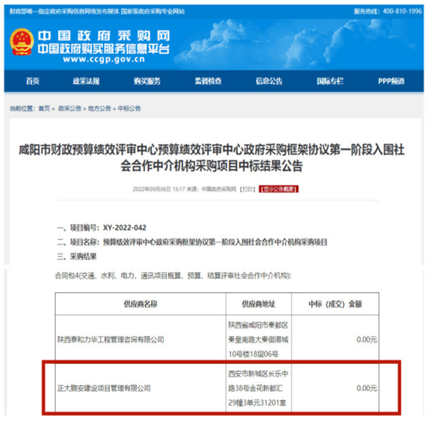 近日,我公司參與”咸陽市財政預算績效評審中心政府采購框架協(xié)議第一階段入圍社會合作中介機構采購項目D標段”項目,經(jīng)評審委員會綜合評審,招標人確認,正大鵬安公司入圍本項目采購代理機構。