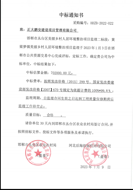 2023年1月9日,經(jīng)評(píng)標(biāo)委員會(huì)評(píng)定,招標(biāo)人確認(rèn),正大鵬安建設(shè)項(xiàng)目管理有限公司中標(biāo)“邯鄲市叢臺(tái)區(qū)美麗鄉(xiāng)村人民環(huán)境整治項(xiàng)目監(jiān)理二標(biāo)段”。