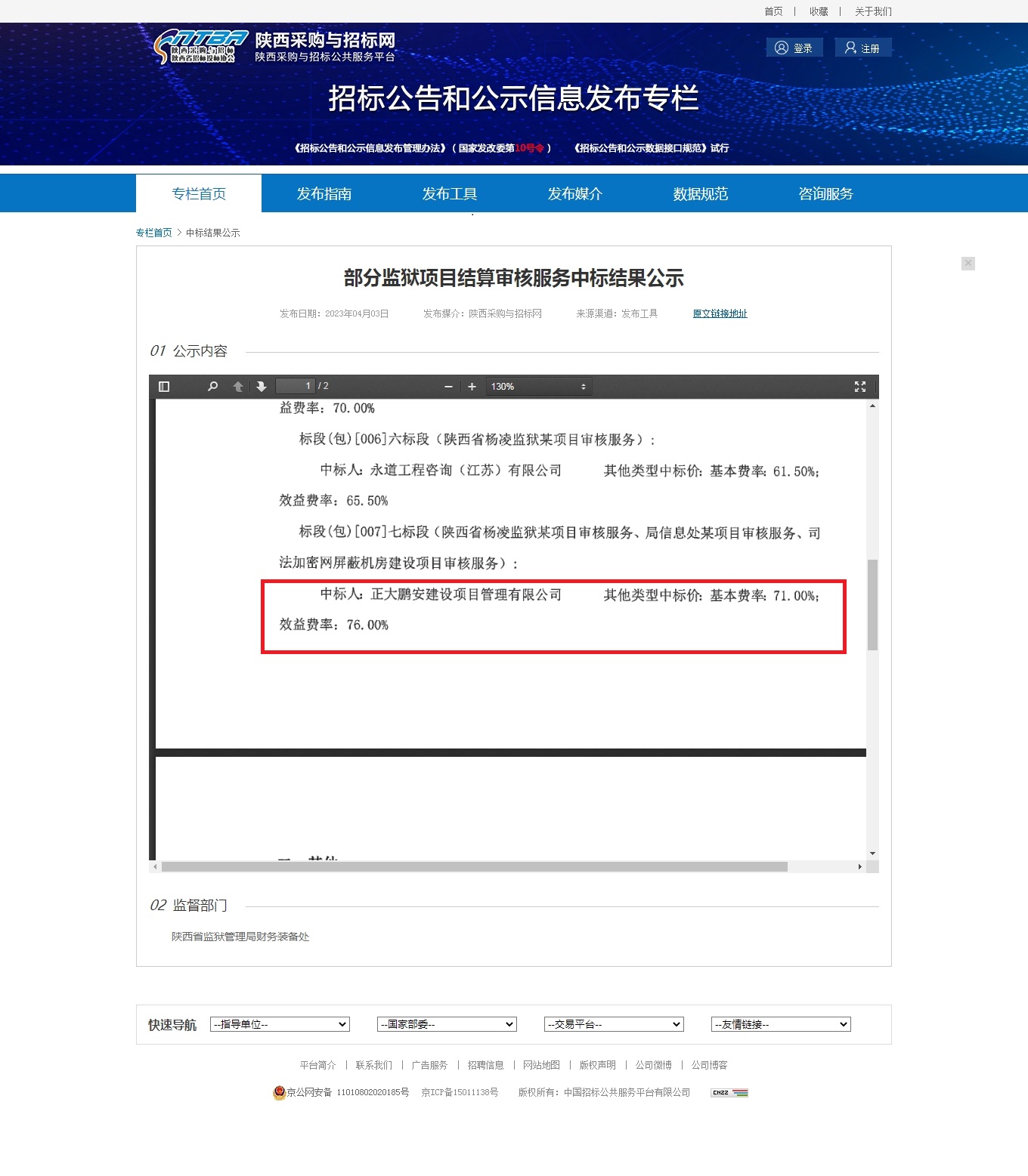 2023年4月,經(jīng)評標委員會評定,招標人確認,正大鵬安建設項目管理有限公司中標陜西省監(jiān)獄管理局的“部分監(jiān)獄項目結(jié)算審核服務七標段”項目。