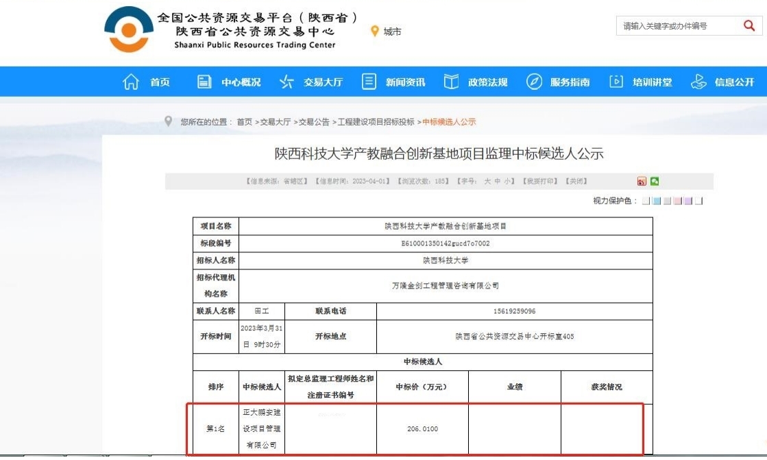 2023年4月,經評標委員會評定,招標人確認,正大鵬安建設項目管理有限公司中標陜西科技大學的“陜西科技大學產教融合創(chuàng)新基地項目監(jiān)理”項目。