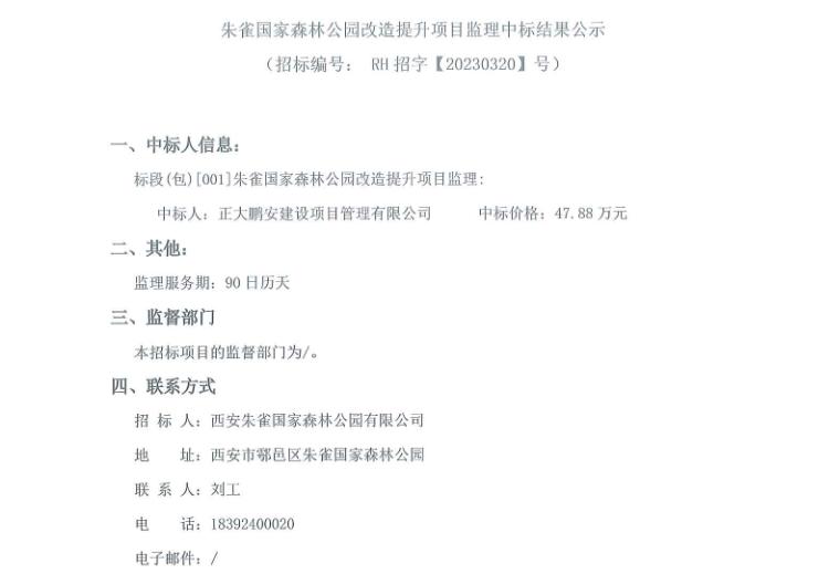 2023年4月,經(jīng)評(píng)標(biāo)委員會(huì)評(píng)定,招標(biāo)人確認(rèn),正大鵬安建設(shè)項(xiàng)目管理有限公司中標(biāo)西安朱雀國家森林公園有限公司的“朱雀國家森林公園改造提升項(xiàng)目監(jiān)理”項(xiàng)目。