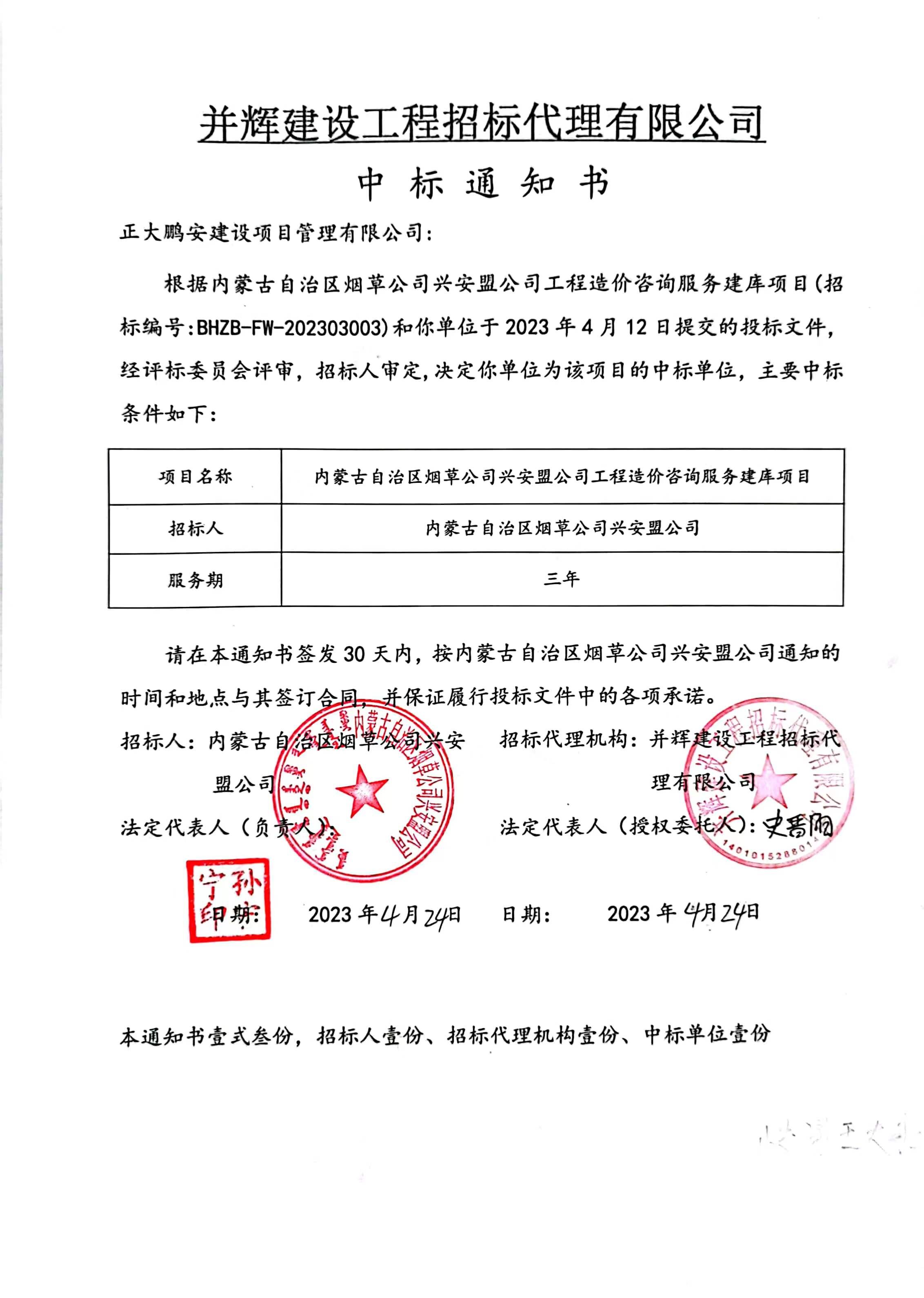 2023年4月24日,經評標委員會評定,招標人確認,正大鵬安中標內蒙古自治區(qū)煙草公司興安盟公司工程造價咨詢服務建庫項目。