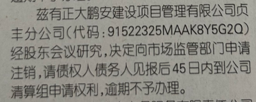 經(jīng)公司股東會(huì)決議,對(duì)正大鵬安建設(shè)項(xiàng)目管理有限公司貞豐分公司(注冊號(hào)91522325MAAK8Y5G2Q)予以注銷,請有債權(quán)債務(wù)的單位和個(gè)人自登報(bào)之日起45日內(nèi)前來辦理相關(guān)事宜,逾期不報(bào)視為放棄處理,特此公告。