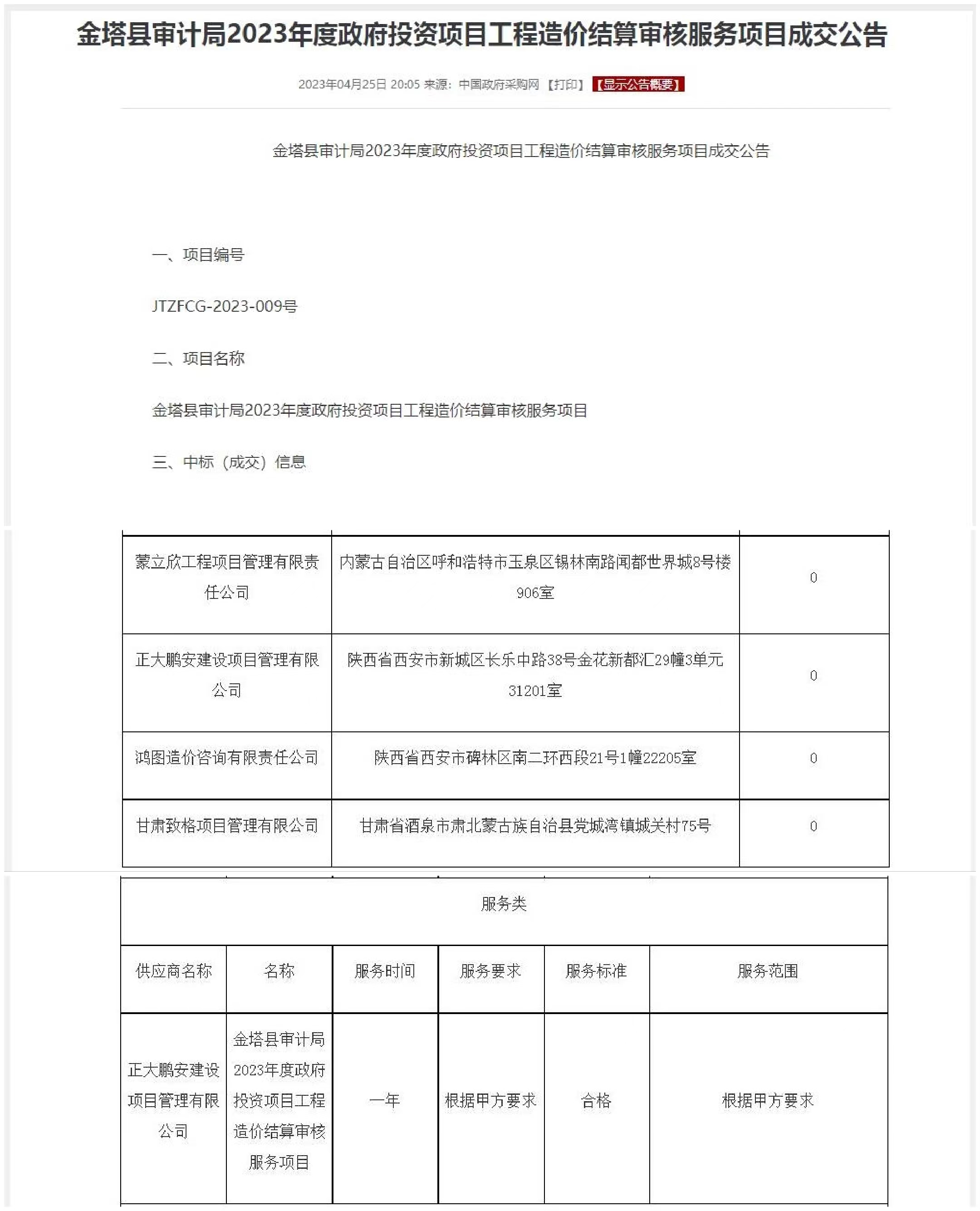 正大鵬安中標(biāo)金塔縣審計(jì)局2023年度政府投資項(xiàng)目工程造價(jià)結(jié)算審核服務(wù)項(xiàng)目