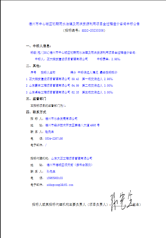 2023年3月,經(jīng)評標委員會評定,招標人確認,正大鵬安建設(shè)項目管理有限公司中標德州市中心城區(qū)初期雨水治理及雨洪資源利用項目全過程造價咨詢項目。