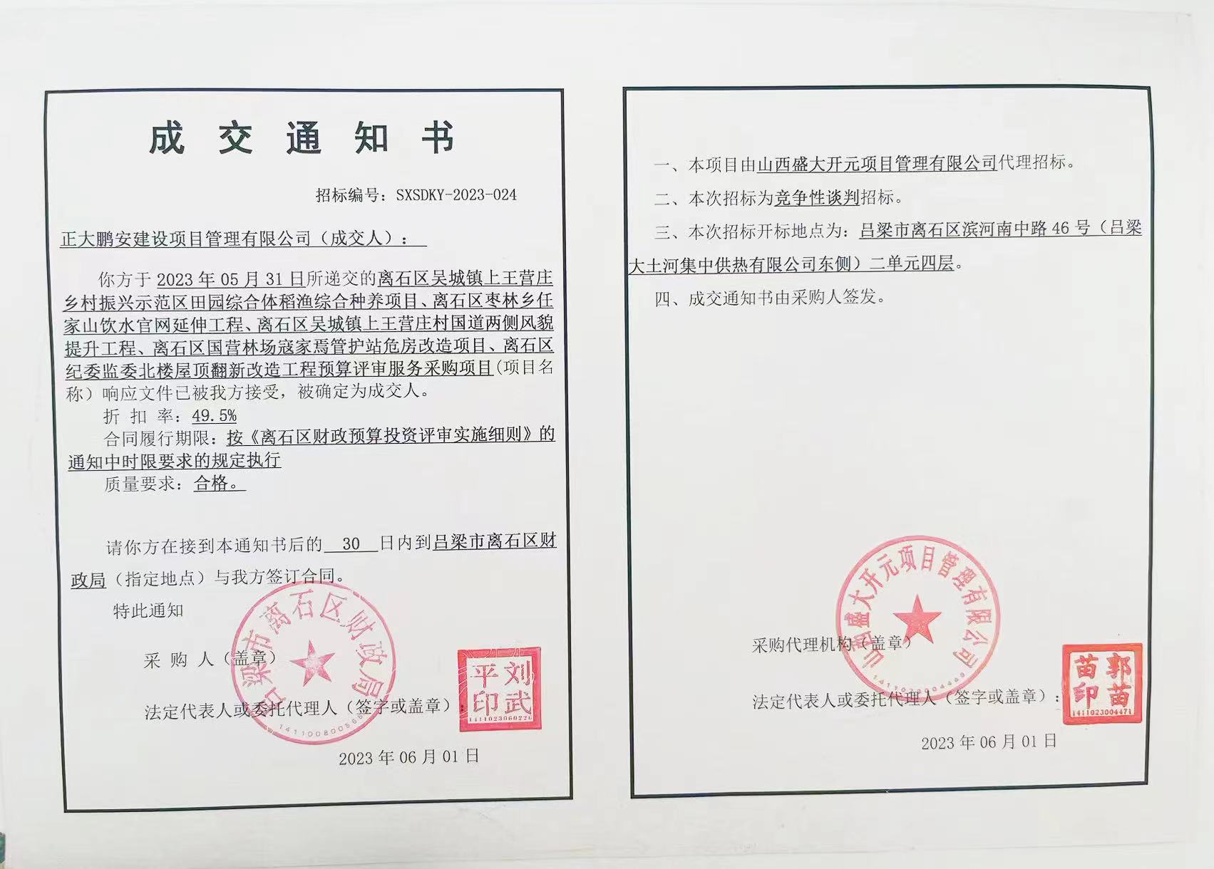 2023年6月,經(jīng)評(píng)標(biāo)委員會(huì)評(píng)定,招標(biāo)人確認(rèn),正大鵬安建設(shè)項(xiàng)目管理有限公司中標(biāo)離石區(qū)吳城鎮(zhèn)上王營(yíng)莊鄉(xiāng)村振興示范區(qū)田園綜合體稻漁綜合種養(yǎng)項(xiàng)目、離石區(qū)棗林鄉(xiāng)任家山飲水官網(wǎng)延伸工程、離石區(qū)吳城鎮(zhèn)上王營(yíng)莊村國(guó)道兩側(cè)風(fēng)貌提升工程、離石區(qū)國(guó)營(yíng)林場(chǎng)寇家焉管護(hù)站危房改造項(xiàng)目、離石區(qū)紀(jì)委監(jiān)委北樓屋頂翻新改造工程預(yù)算評(píng)審服務(wù)采購(gòu)項(xiàng)目。
