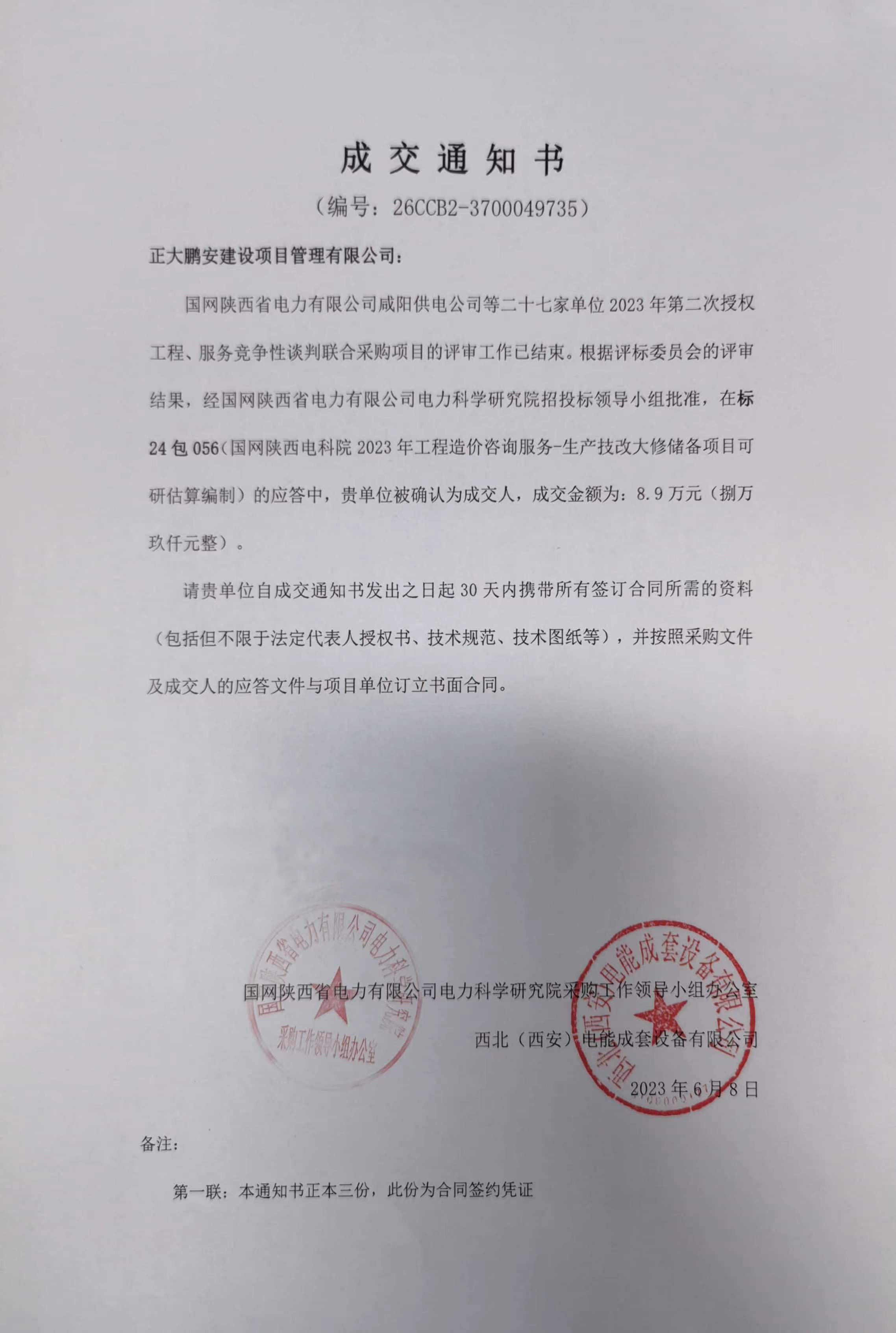 正大鵬安中標(biāo)國網(wǎng)陜西電科院2023年工程造價咨詢服務(wù)-生產(chǎn)技改大修儲備項目可研估算編制項目