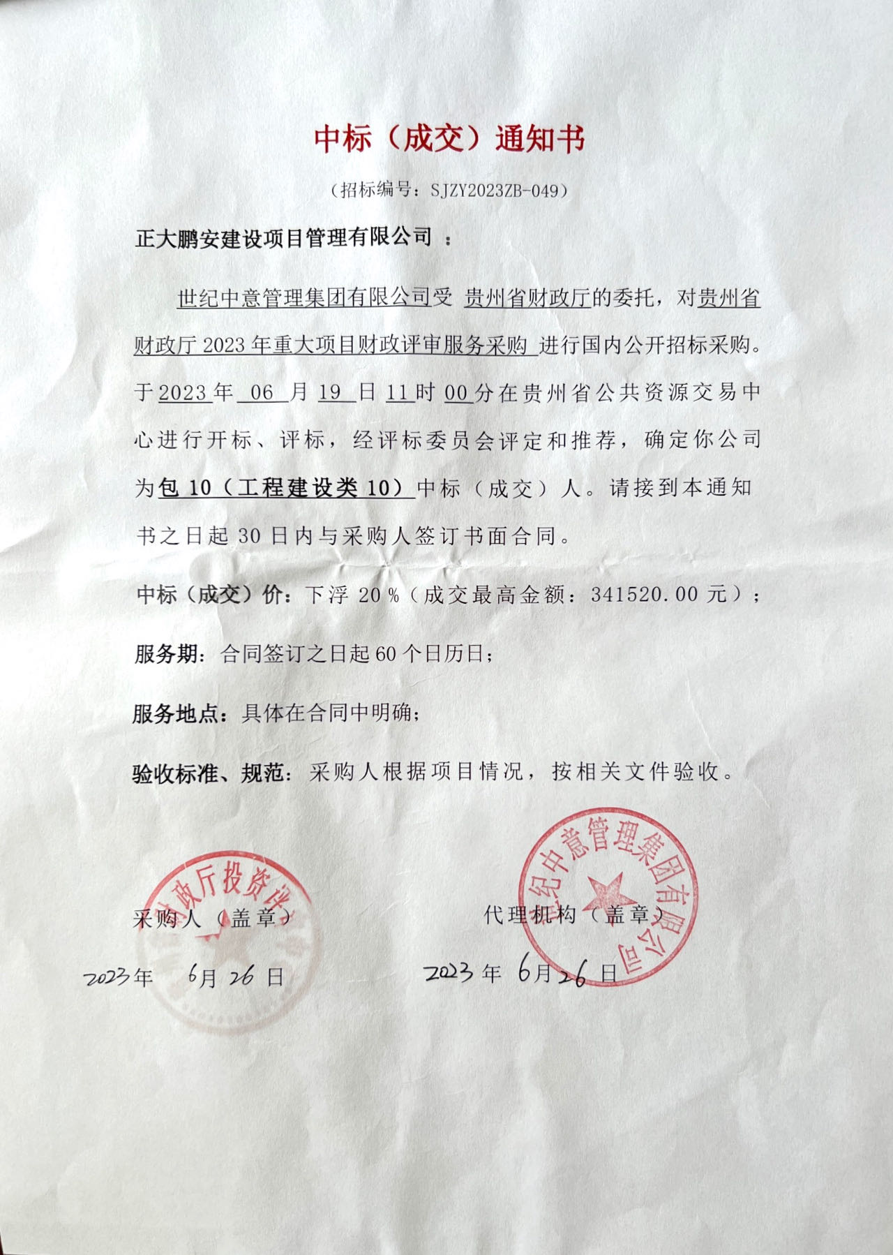 2023年6月,經(jīng)評標委員會綜合評審,招標人確認,正大鵬安建設項目管理有限公司中標“貴州省財政廳2023年重大項目財政評審服務采購包10(工程建設類10)”
