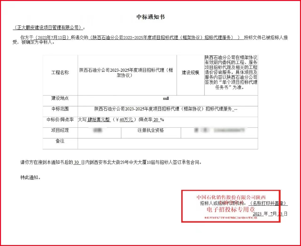 正大鵬安中標(biāo)陜西石油分公司2023-2025年度項目招標(biāo)代理(框架協(xié)議)招標(biāo)代理服務(wù)