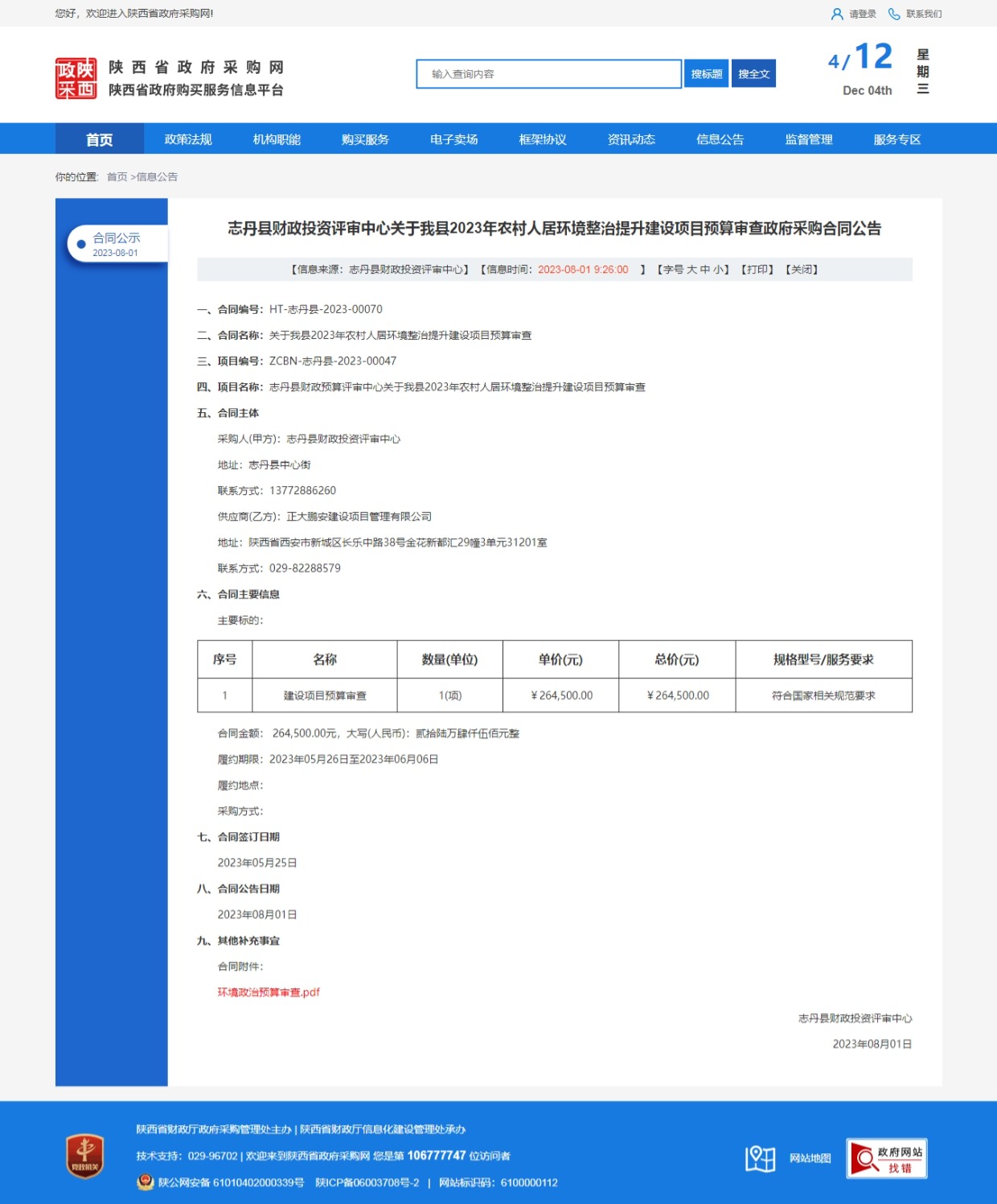 2023年7月31日,經(jīng)評標委員會綜合評審,招標人確認,正大鵬安建設(shè)項目管理有限公司中標志丹縣2023年農(nóng)村人居環(huán)境整治提升建設(shè)項目預(yù)算審查政府采購合同。