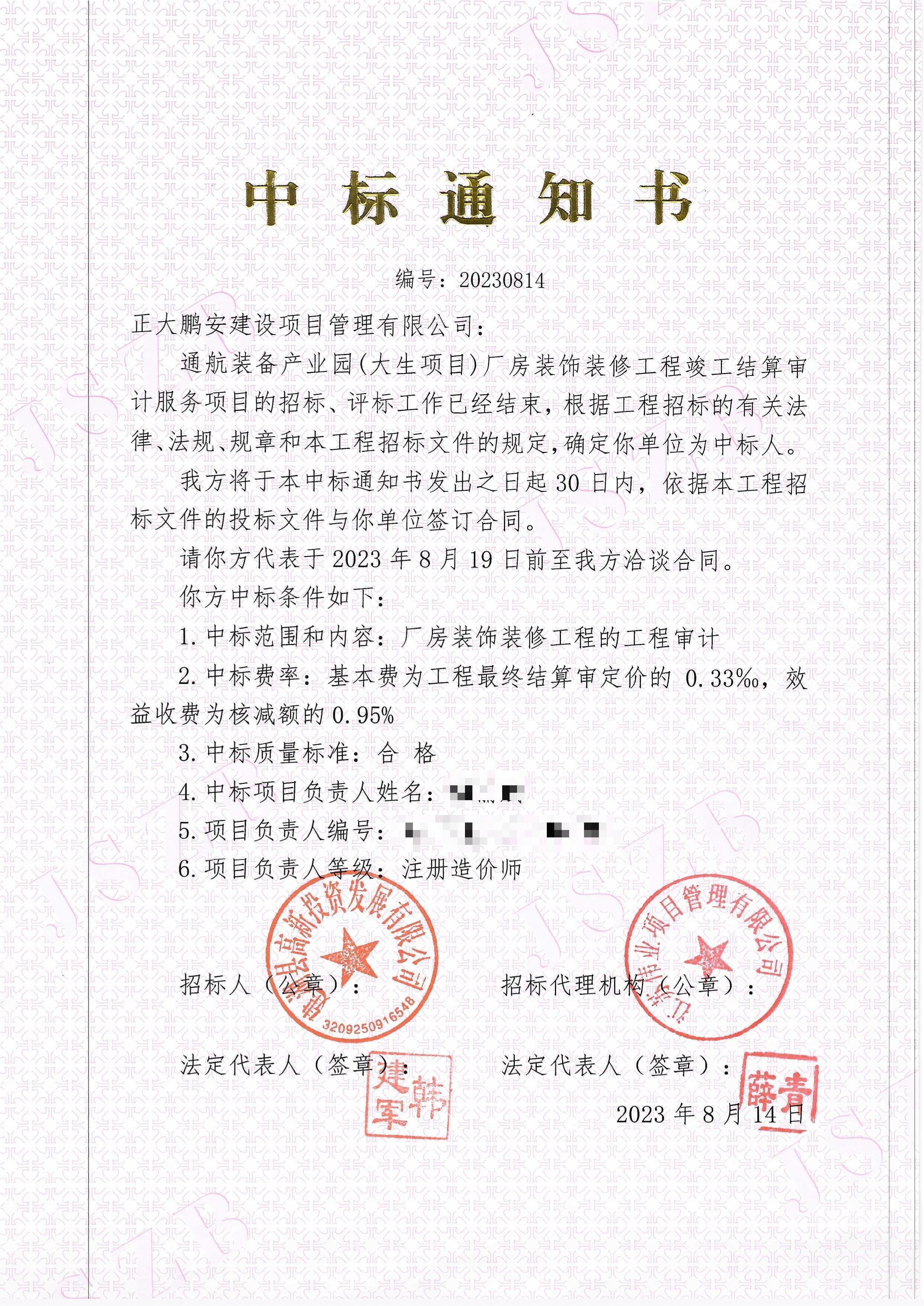 2023年8月,經(jīng)評(píng)標(biāo)委員會(huì)評(píng)定,招標(biāo)人確認(rèn),正大鵬安建設(shè)項(xiàng)目管理有限公司中標(biāo)通航裝備產(chǎn)業(yè)園(大生項(xiàng)目)廠房裝飾裝修工程竣工結(jié)算審計(jì)服務(wù)項(xiàng)目。