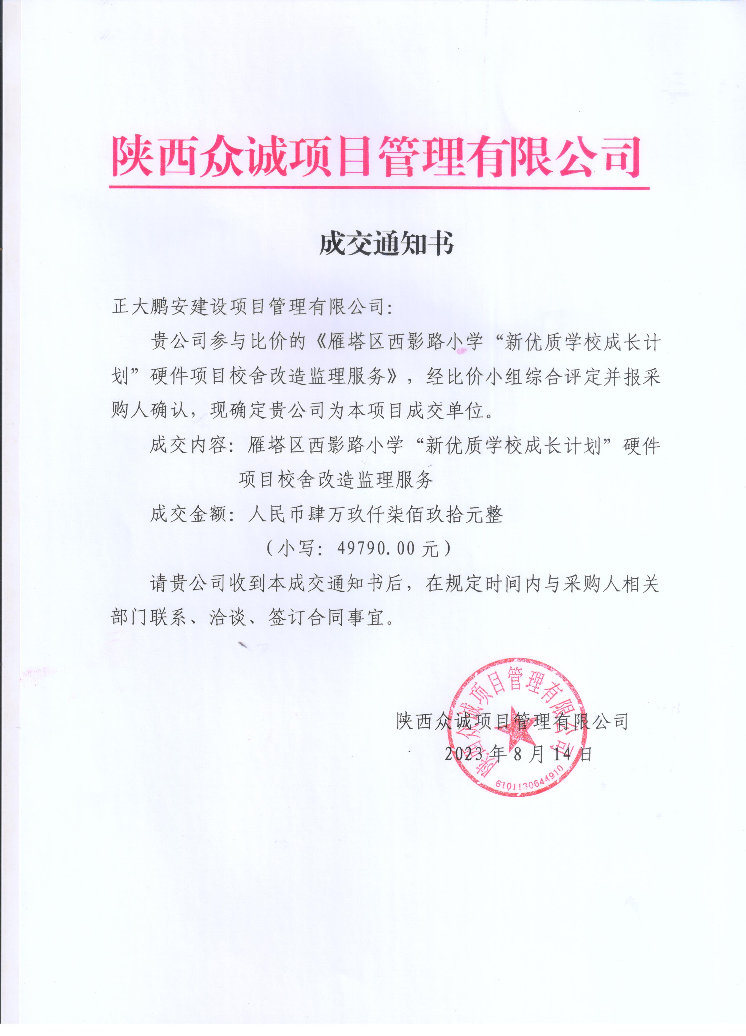 2023年8月,經(jīng)評(píng)標(biāo)委員會(huì)評(píng)定,招標(biāo)人確認(rèn),正大鵬安建設(shè)項(xiàng)目管理有限公司中標(biāo)西安市雁塔區(qū)西影路小學(xué)的“雁塔區(qū)西影路小學(xué)“新優(yōu)質(zhì)學(xué)校成長(zhǎng)計(jì)劃”硬件項(xiàng)目校舍改造監(jiān)理。