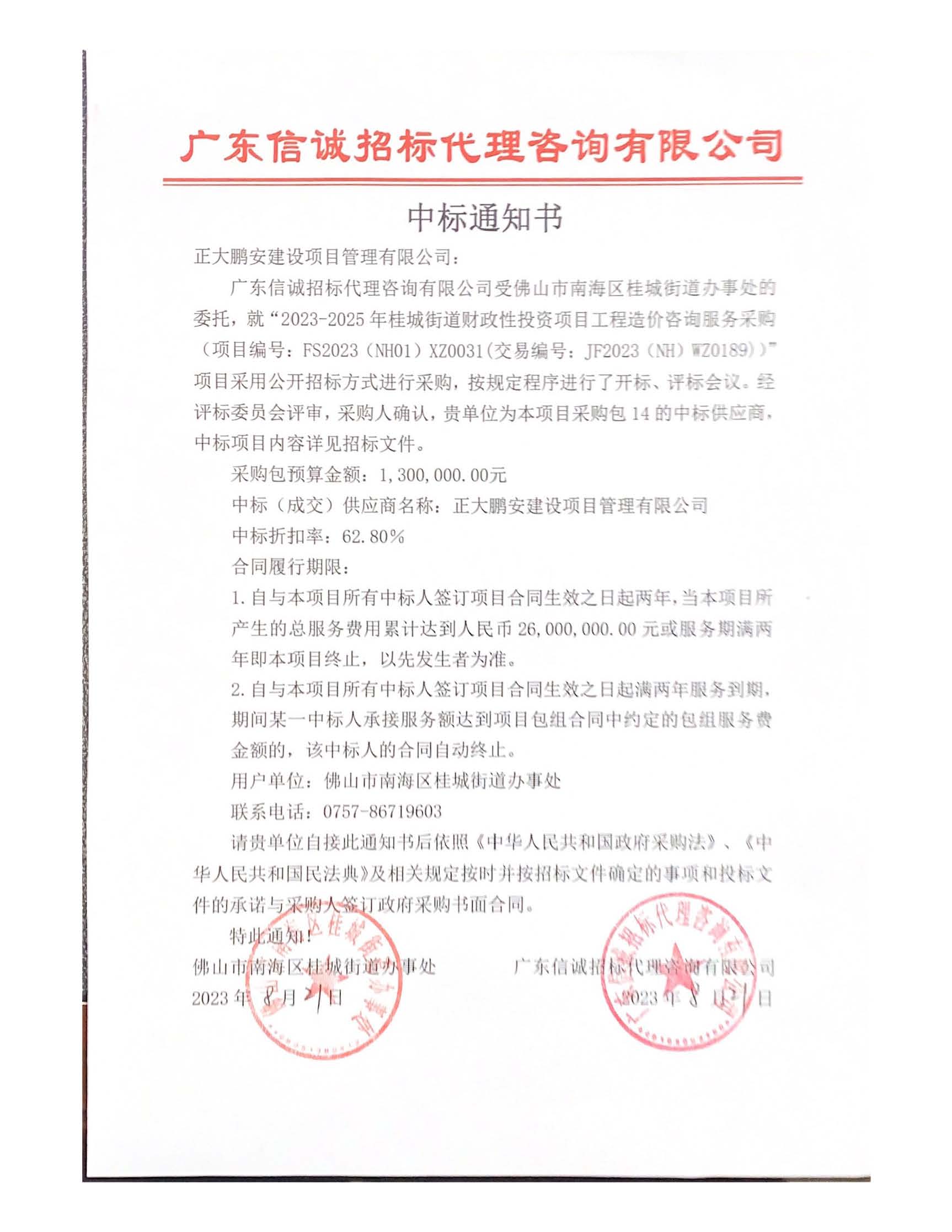 正大鵬安中標(biāo)2023-2025 年桂城街道財政性投資項目工程造價咨詢服務(wù)采購項目