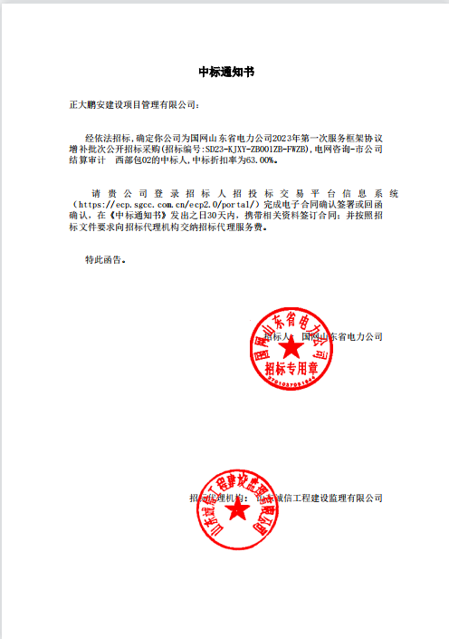 2023年8月,經(jīng)評(píng)標(biāo)委員會(huì)評(píng)定,招標(biāo)人確認(rèn),正大鵬安建設(shè)項(xiàng)目管理有限公司中標(biāo)國(guó)網(wǎng)山東省電力公司2023年第一次服務(wù)框架協(xié)議增補(bǔ)批次公開招標(biāo)采購(gòu)(招標(biāo)編號(hào):SD23-KJXY-ZB001ZB-FWZB),電網(wǎng)咨詢-市公司結(jié)算審計(jì)西部包02的中標(biāo)人。