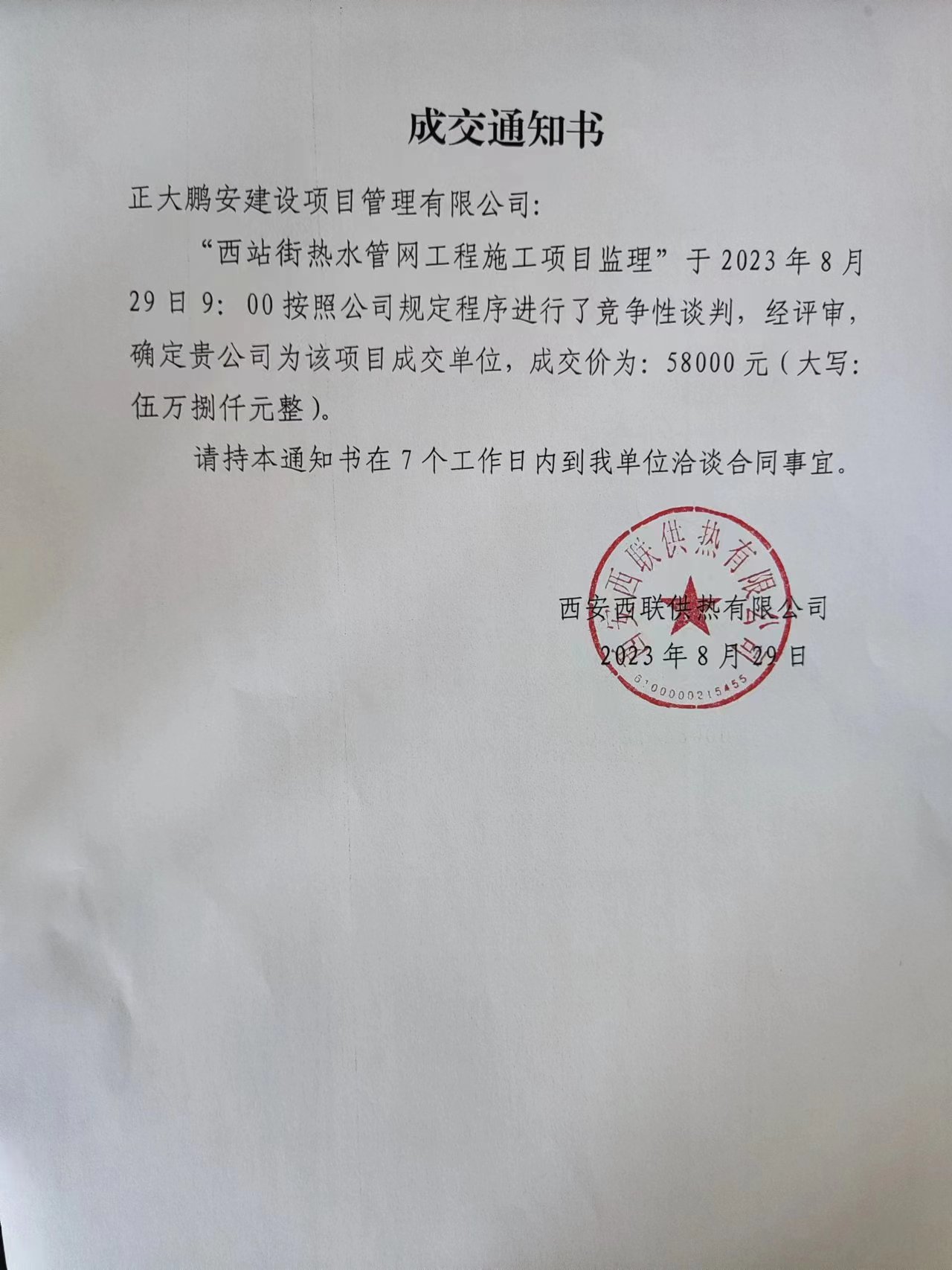 2023年8月,經(jīng)評標委員會評定,招標人確認,正大鵬安建設項目管理有限公司中標西安西聯(lián)供熱有限公司的“西站街熱水管網(wǎng)工程施工項目監(jiān)理”項目。