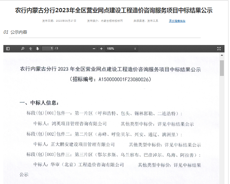 2023年9月,經(jīng)評標委員會評定,招標人確認,正大鵬安建設項目管理有限公司中標“農(nóng)行內(nèi)蒙古分行2023年全區(qū)營業(yè)網(wǎng)點建設工程造價咨詢服務項目標段(包)[002]包件二”。