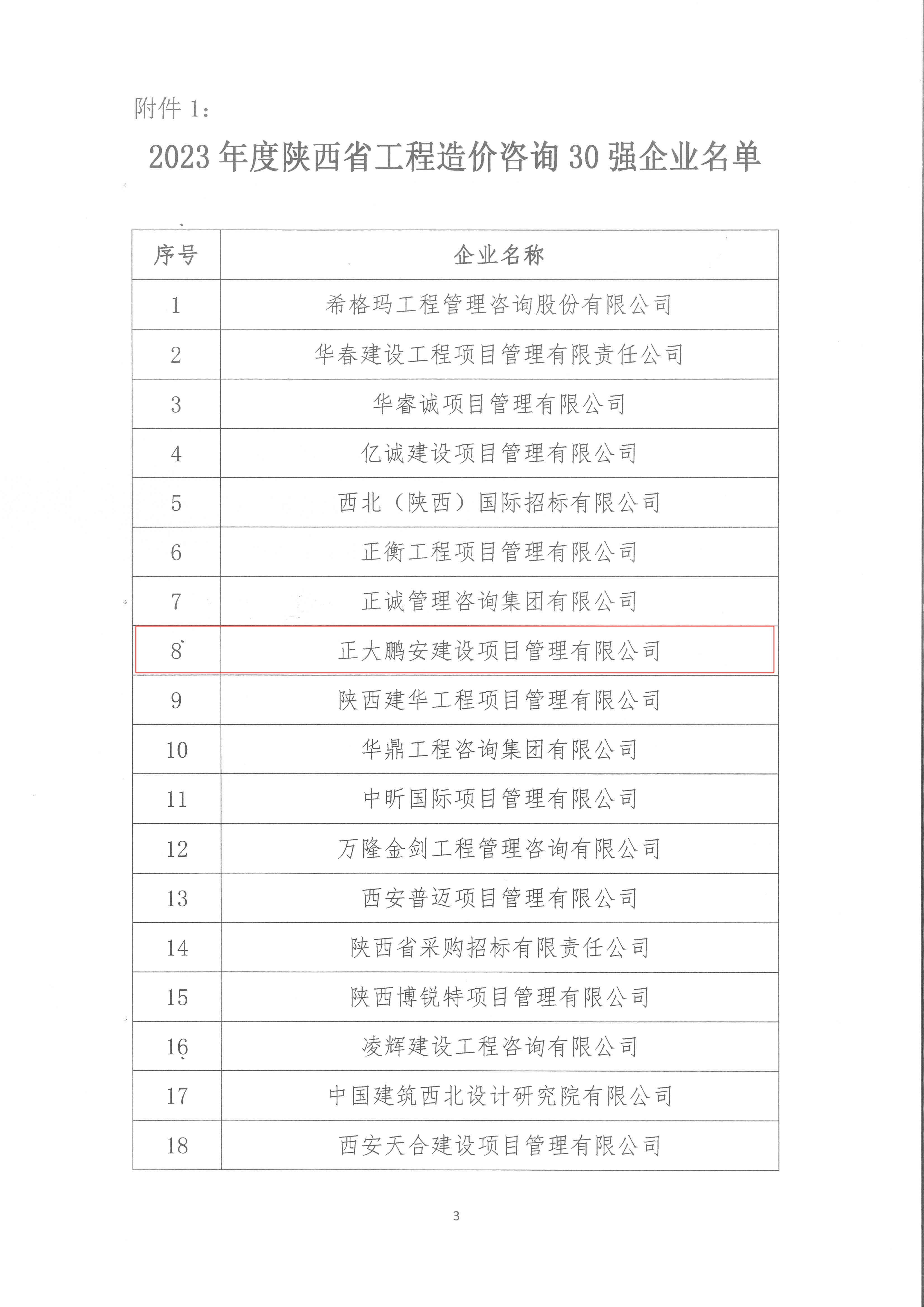 2023年9月15日,經(jīng)陜西省建設(shè)工程造價管理協(xié)會審議通過并公示,正大鵬安榮獲“陜西省工程造價咨詢30強(qiáng)企業(yè)”稱號。