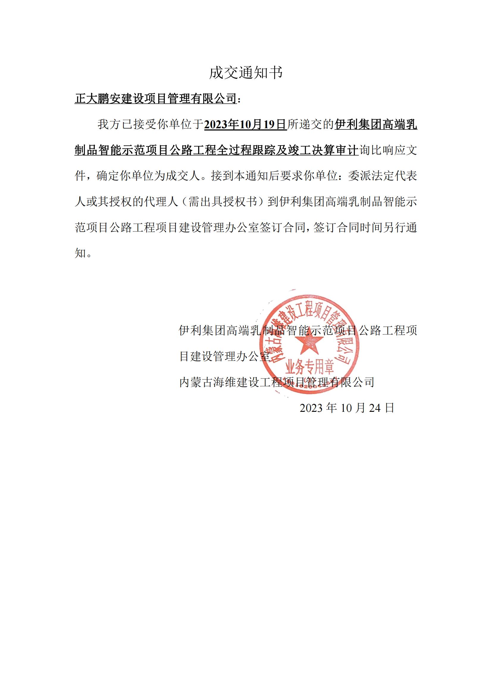 2023年10月,經(jīng)評標委員會評定,招標人確認,正大鵬安建設(shè)項目管理有限公司中標“伊利集團高端乳制品智能示范項目公路工程全過程跟蹤及竣工決算審計項目”。