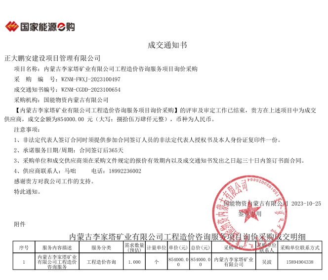 2023年10月,經(jīng)評標委員會評定,招標人確認,正大鵬安建設(shè)項目管理有限公司中標“內(nèi)蒙古李家塔礦業(yè)有限公司工程造價咨詢服務(wù)項目詢價采購”。